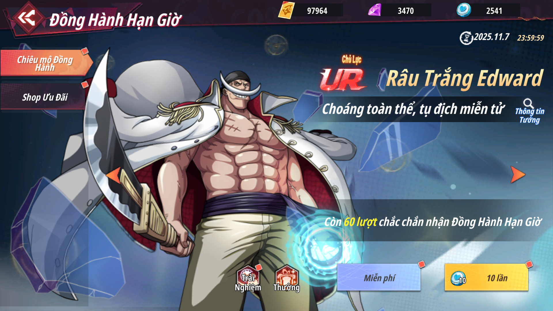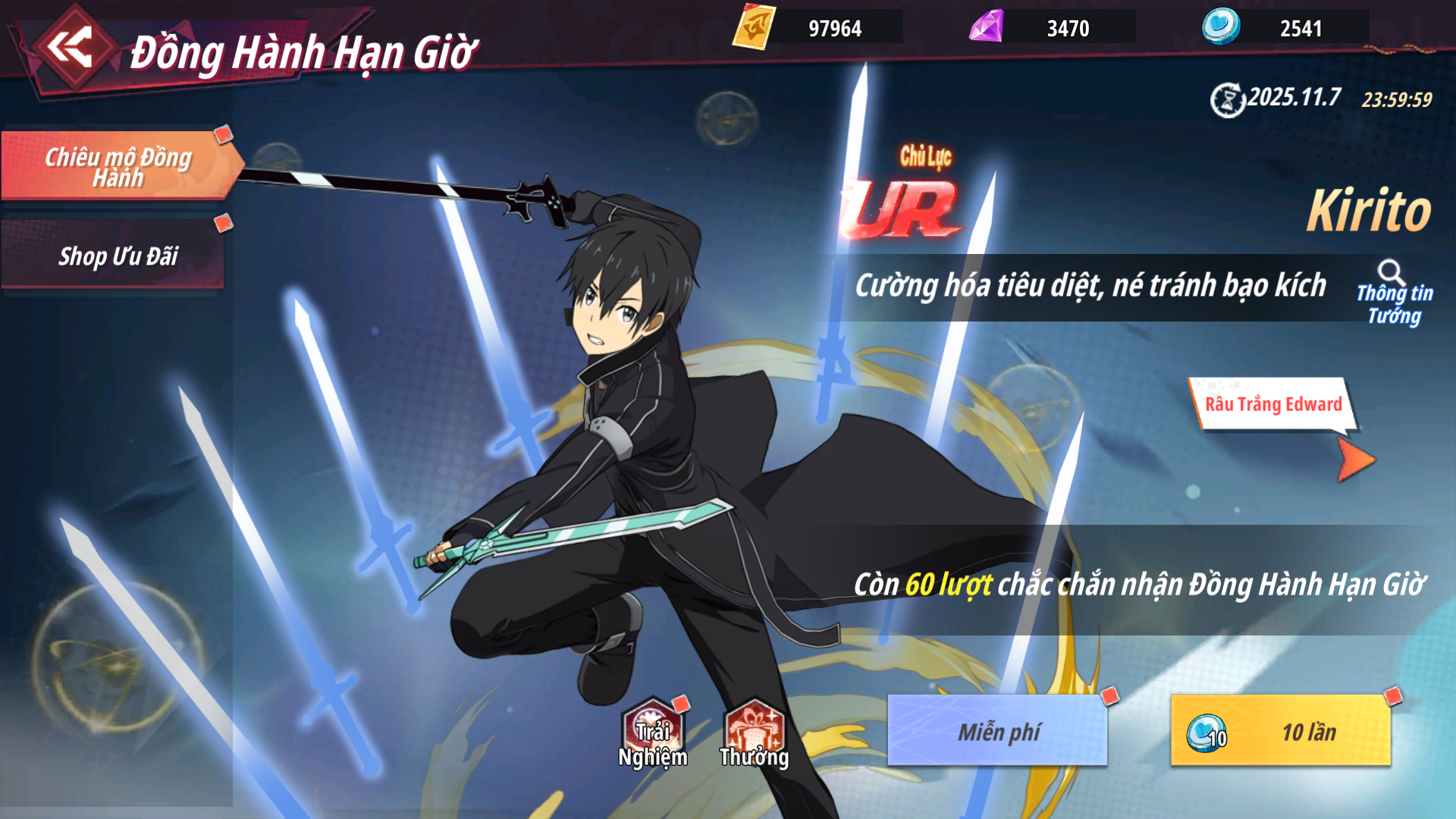 - Shop Ưu Đãi: Các gói có hạn mua nhất định nhận được Xu Đồng Hành dùng để chiêu mộ đồng hành được tướng UR Kirito , Râu Trắng Edward và Lacus