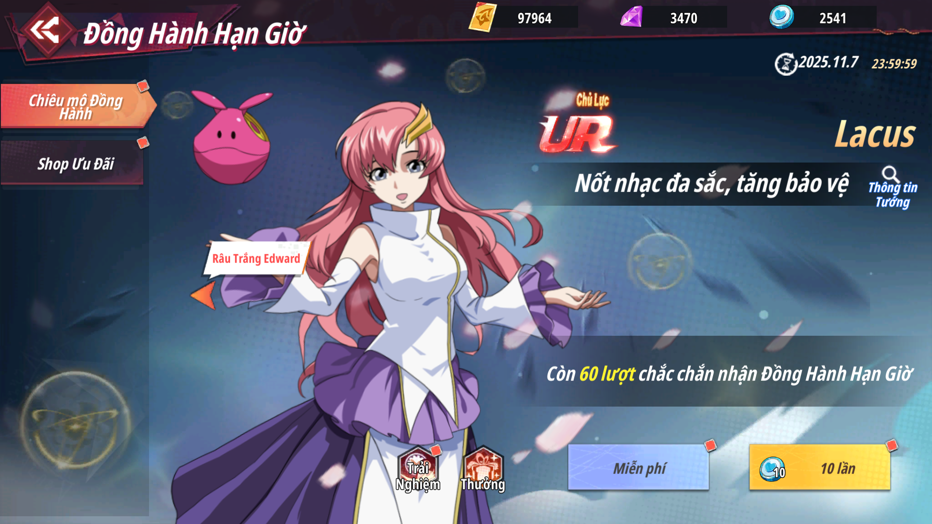 - Tham gia sự kiện Đồng Hành Hạn Giờ có cơ hội nhận được tướng UR Chủ lực Kirito , Râu Trắng Edward và Lacus