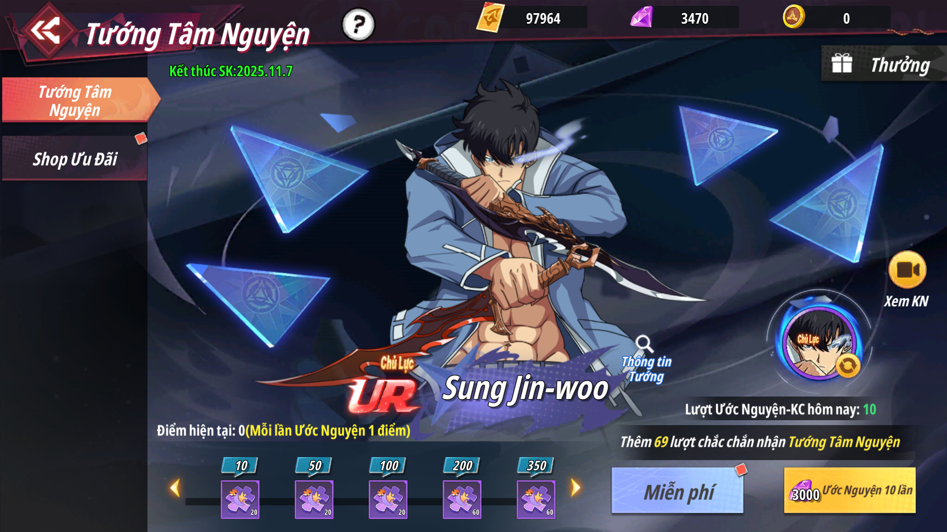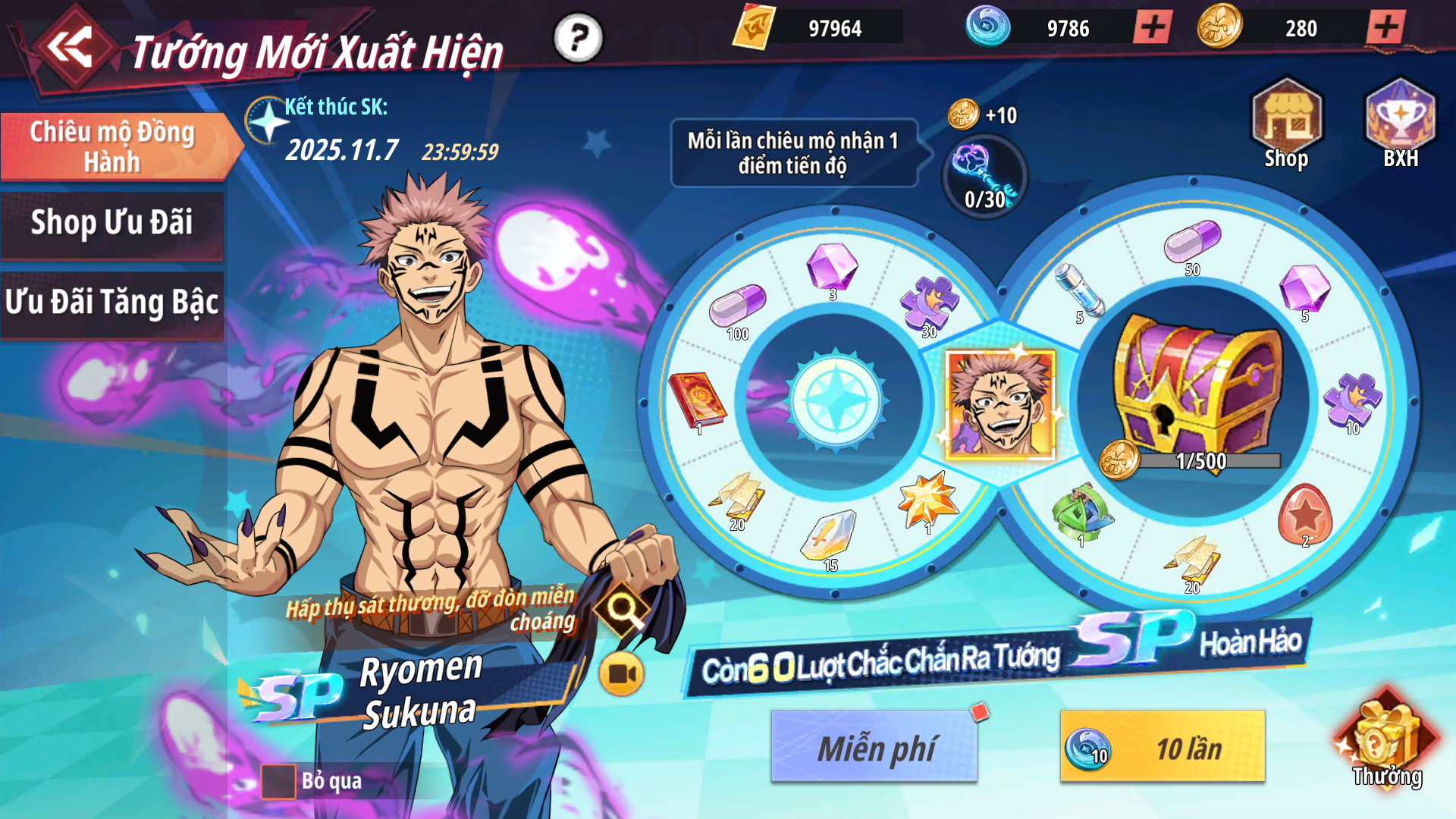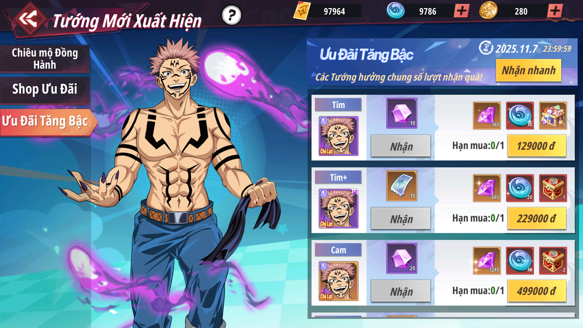 - Shop Ưu Đãi: Bán các gói giới hạn, nhận Xu Thần Thoại dùng để chiêu mộ đồng hành cùng SP – Ryomen Sukuna.