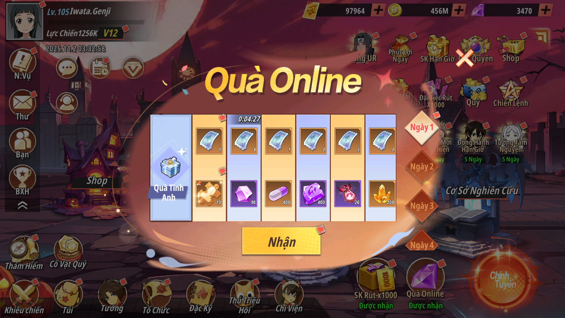 - Tiến hành đăng nhập và online game mỗi ngày đạt đủ điều kiện của mốc sẽ được nhận thưởng