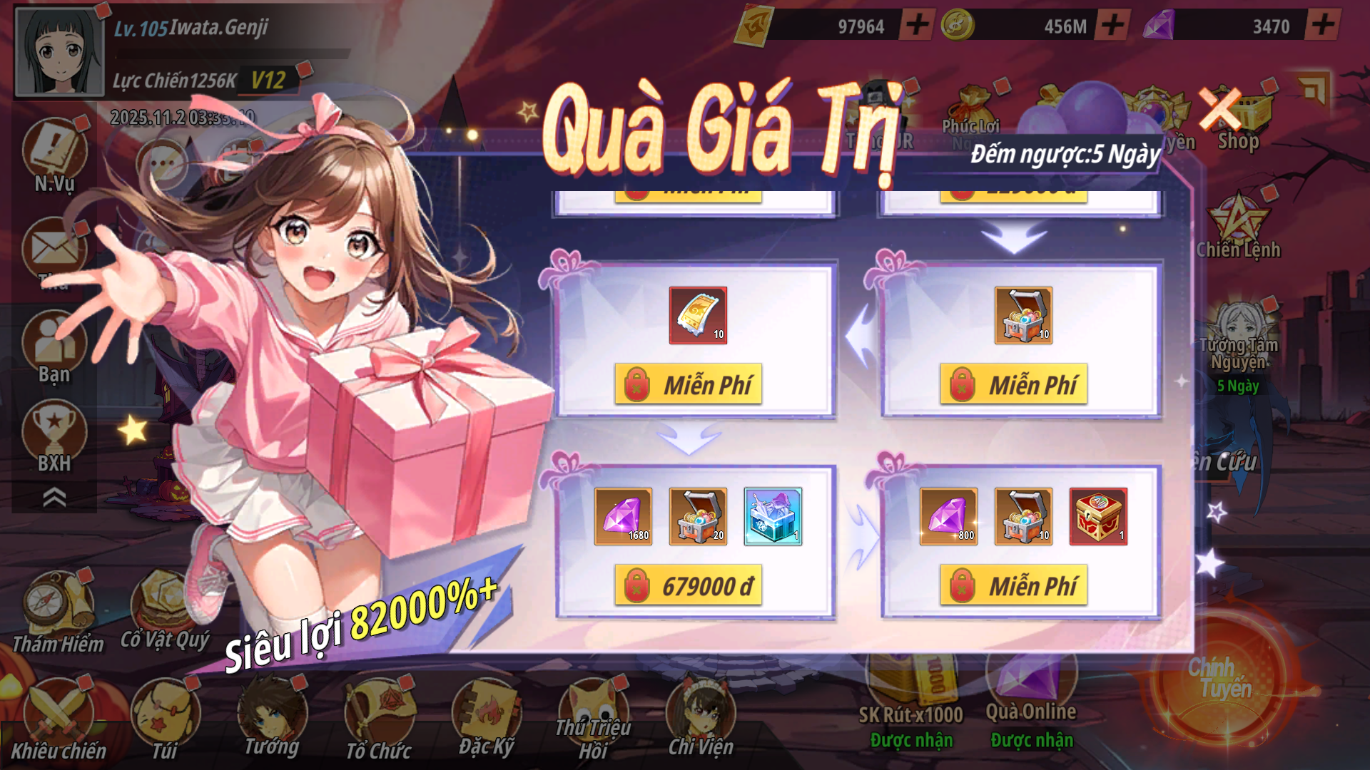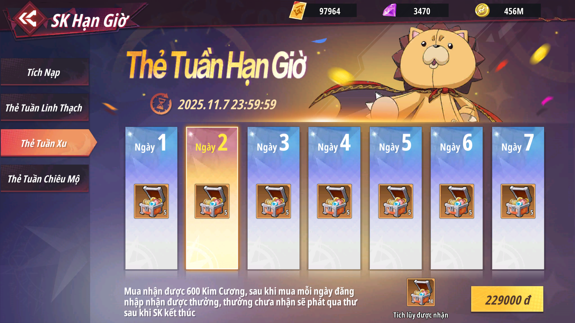 - Sau khi mua hoàn trả nhận lại 600 Kim Cương, mỗi ngày đăng nhập nhận Rương Xu - Sơ theo mốc ngày, phần thưởng chưa nhận được sẽ tự động phát qua thư khi sự kiện kết thúc