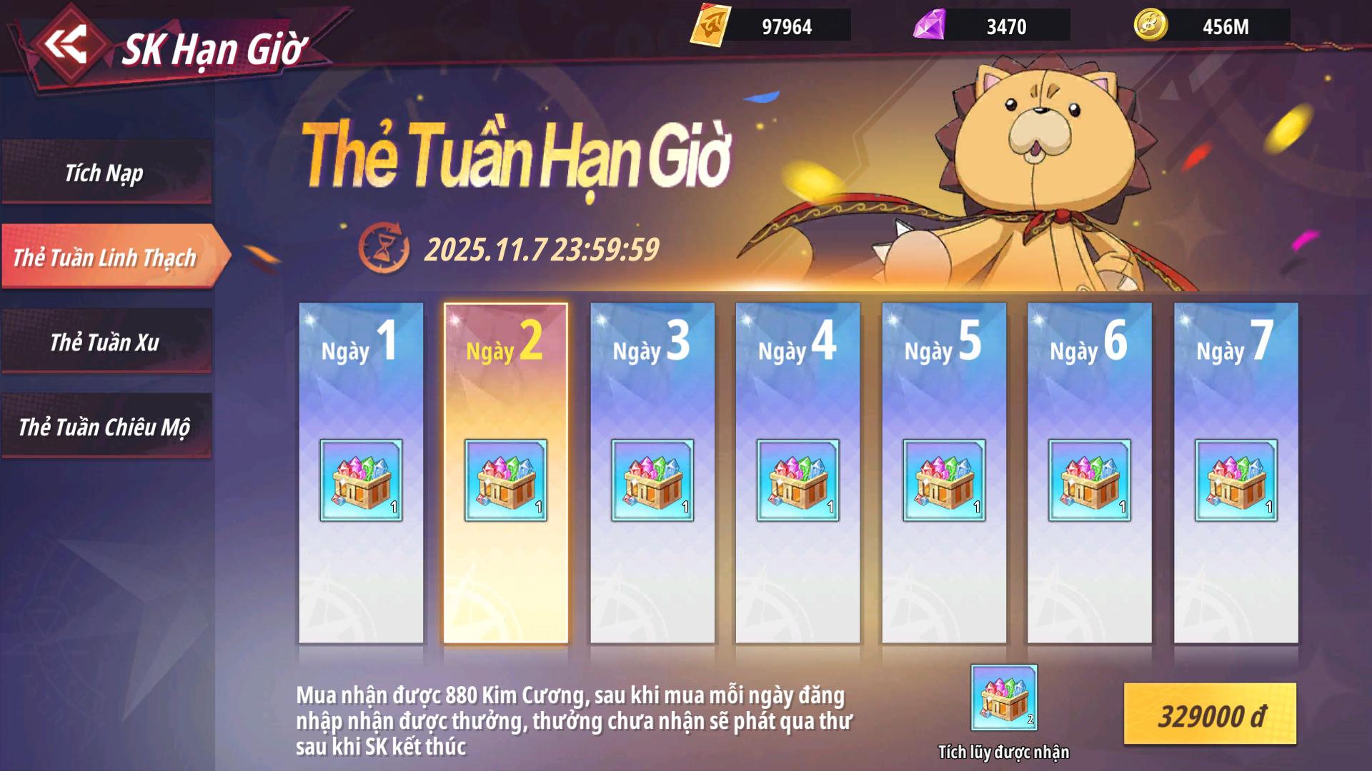 - Sau khi mua hoàn trả nhận lại 880 Kim Cương, mỗi ngày đăng nhập nhận Rương Xu - Sơ theo mốc ngày, phần thưởng chưa nhận được sẽ tự động phát qua thư khi sự kiện kết thúc