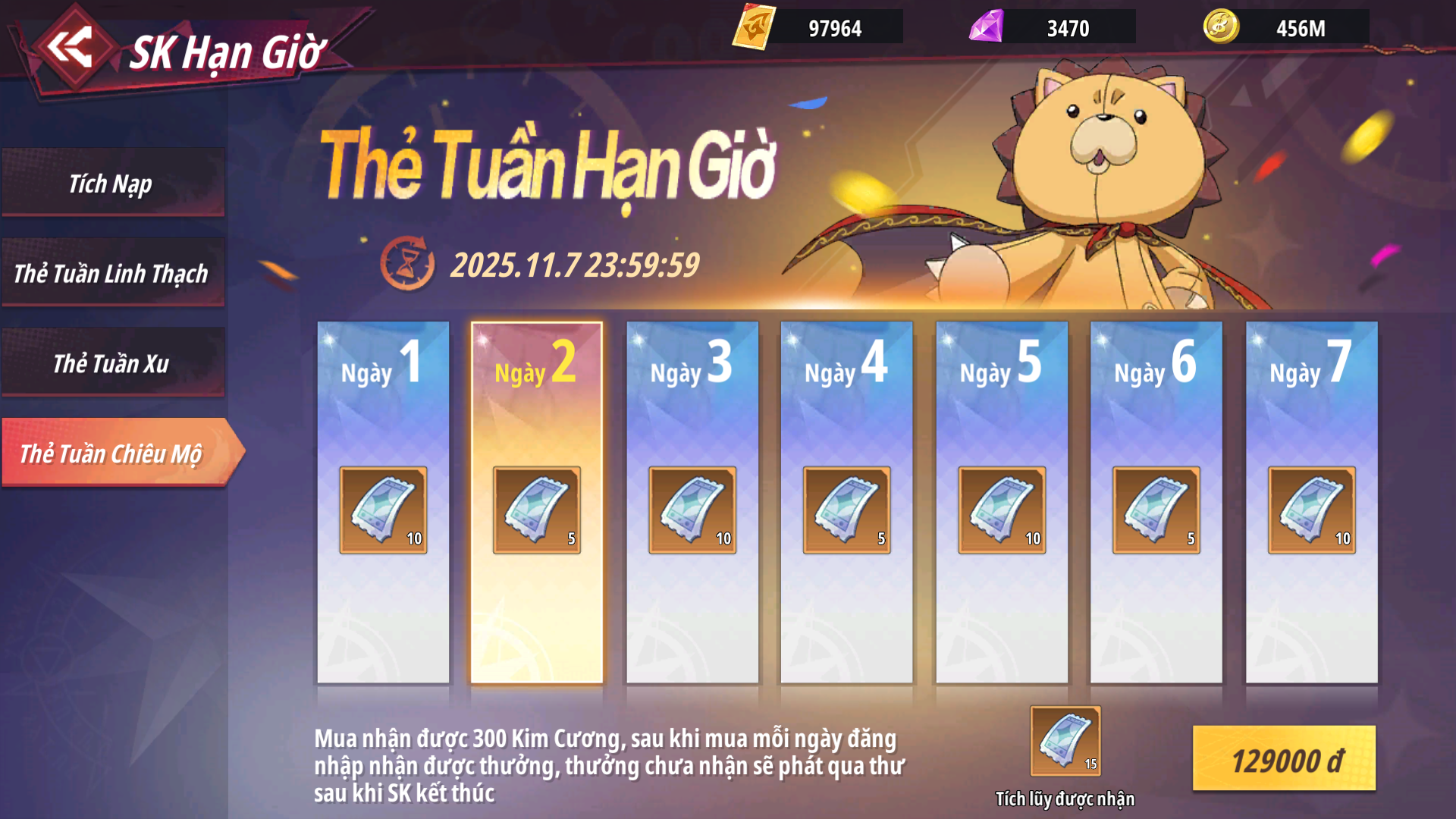 - Sau khi mua hoàn trả nhận lại 300 Kim Cương, mỗi ngày đăng nhập nhận Quà Vé Chiêu Mộ theo mốc ngày, phần thưởng chưa nhận được sẽ tự động phát qua thư khi sự kiện kết thúc