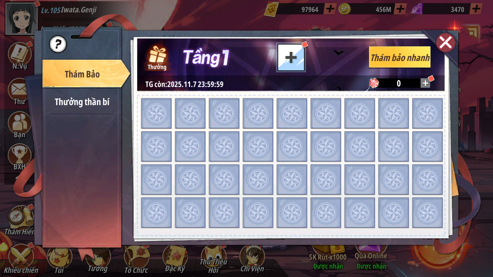 - Khi thám bảo từng tầng, có tỉ lệ nhận Kho Báu đã chọn; nếu chưa có thì lần cuối ở tầng đó sẽ chắc chắn nhận.