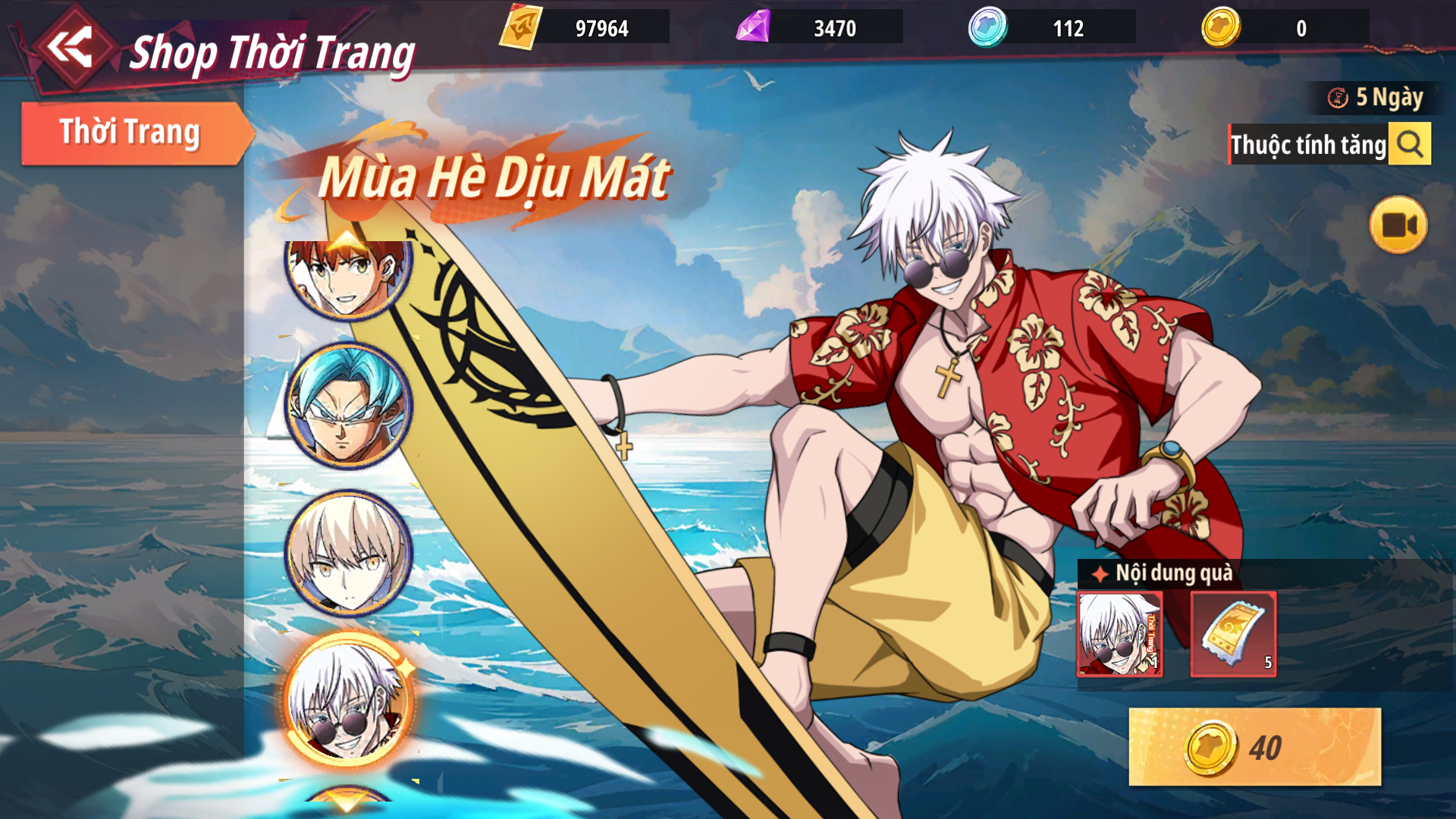 - Tuần đầu của server phần thưởng gồm:Satoru Gojo - Mùa Hè Dịu Mát, Son Goku SS3 - Thần Siêu Saiya, Roy Mustang - Bá Tước Vampire, Shirou Emiya - Muramasa, Sasuke - Hình Thái Susanoo, Saber - Party Đồ Bơi, Gilgamesh - Hoàng Đế, Regoku Kyojuro - Hiện Đại Sang Trọng, Natsu - Hóa Rồng, Kiritani Kazuto - Lời Thề Thuần Khiết