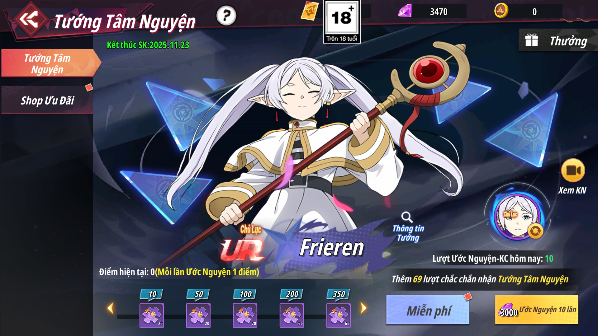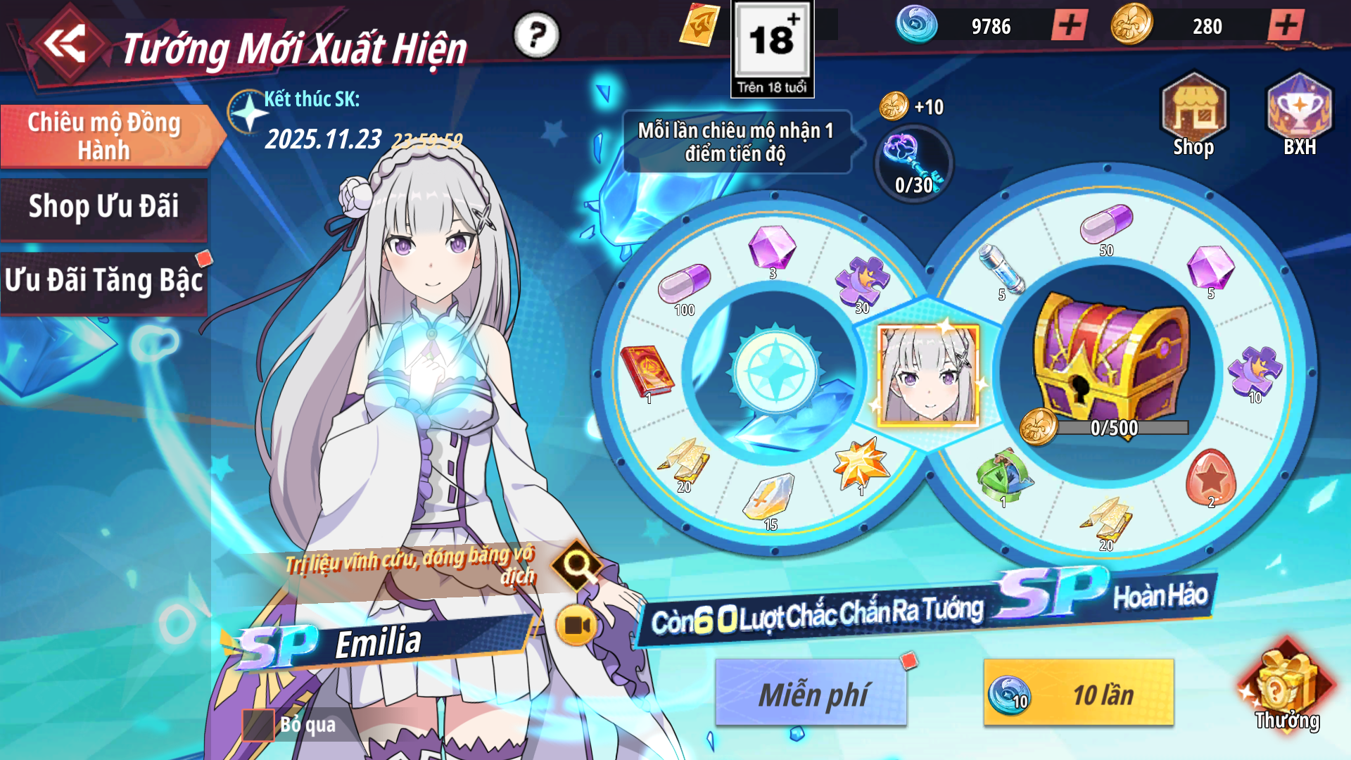 - Shop Ưu Đãi: Bán các gói giới hạn, nhận Xu Thần Thoại dùng để chiêu mộ đồng hành cùng SP – Emilia.