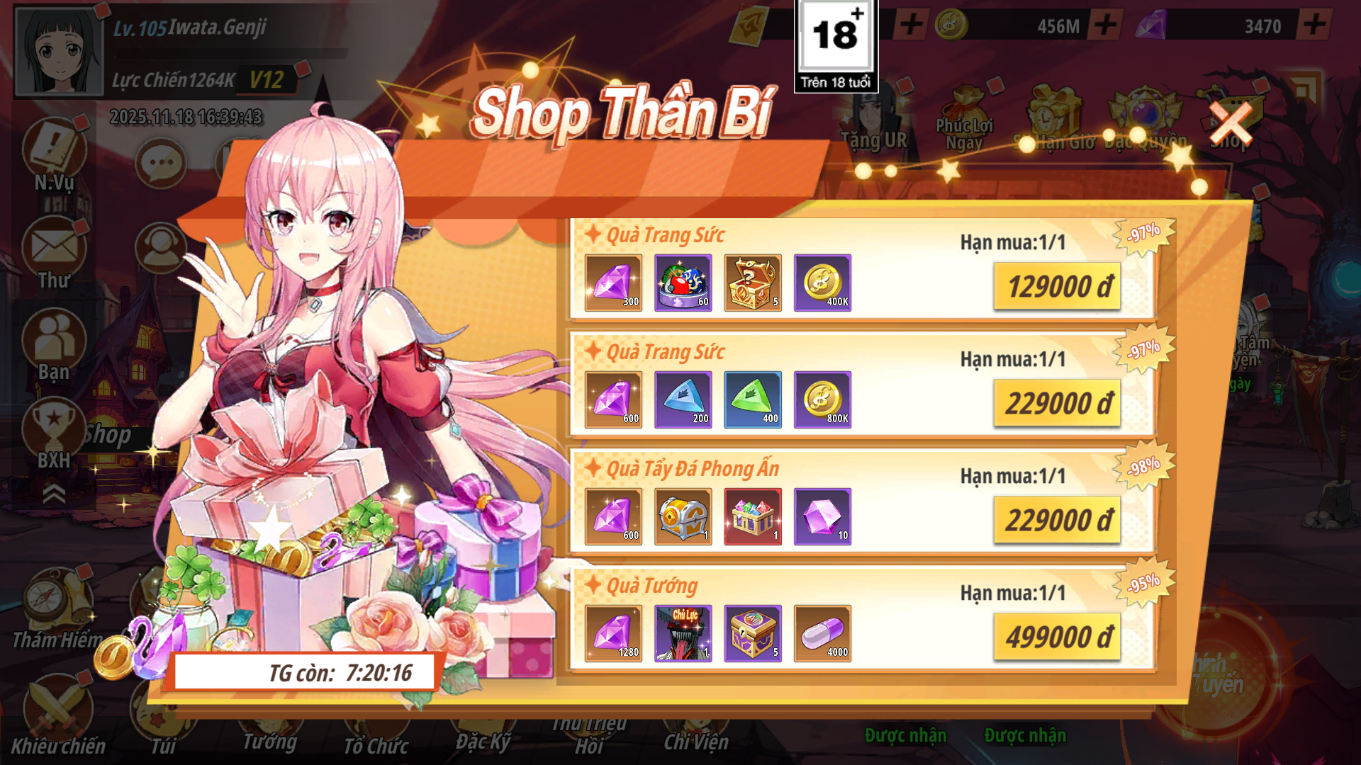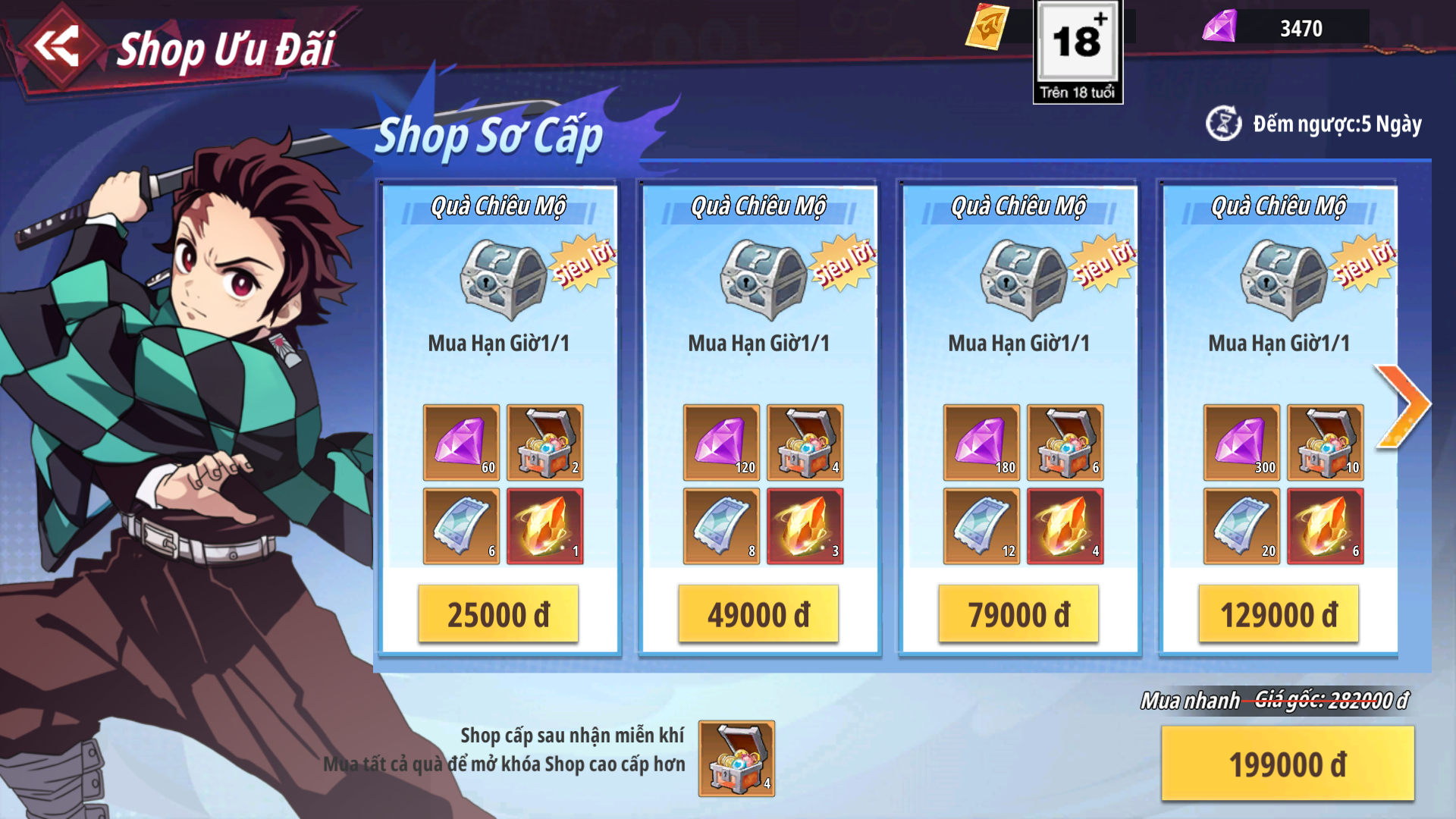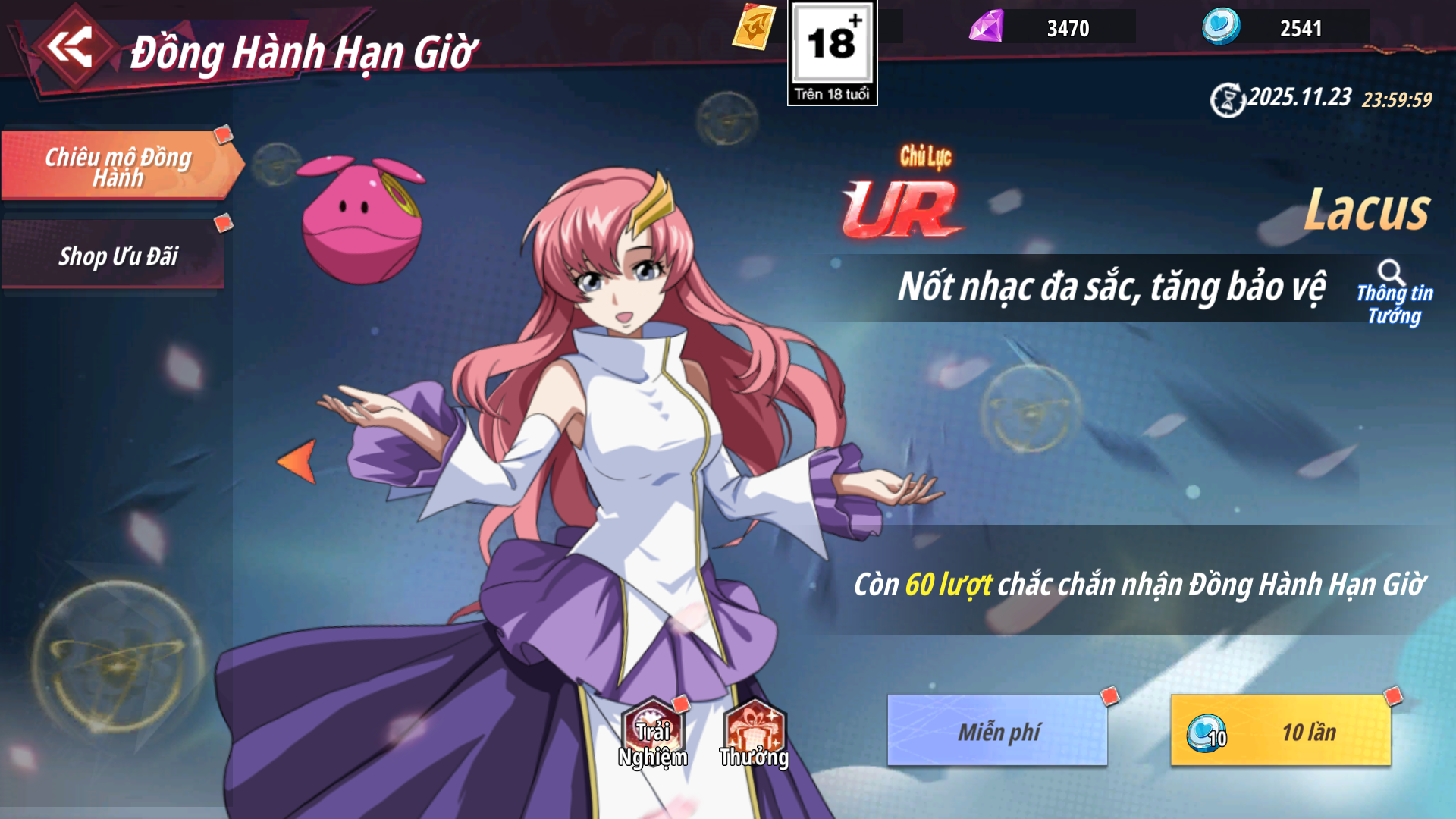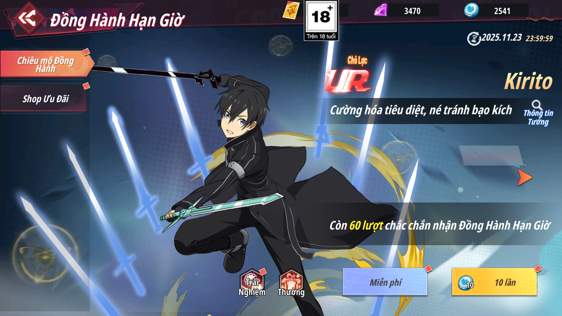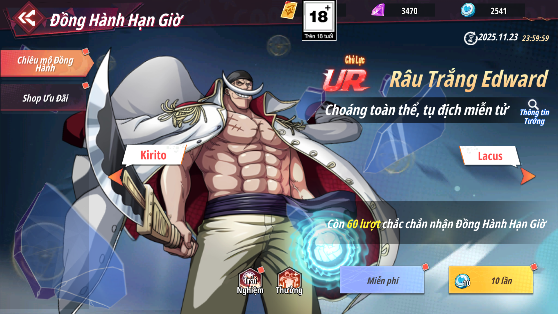 - Shop Ưu Đãi: Các gói có hạn mua nhất định nhận được Xu Đồng Hành dùng để chiêu mộ đồng hành được tướng UR Kirito , Râu Trắng Edward và Lacus