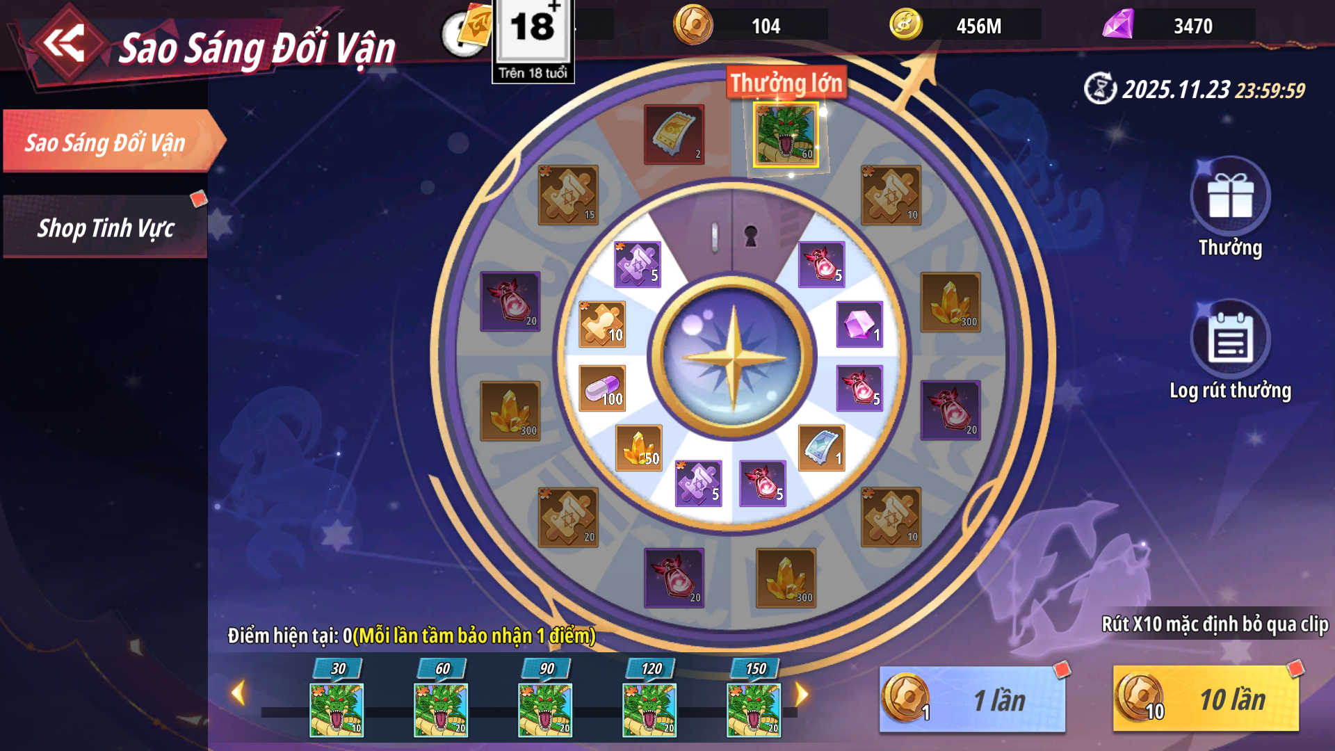 - Tham gia sự kiện Sao Sáng Đổi Vận, sử dụng Bụi Sao Quay 12 Chòm Sao rút thưởng, đảm bảo cơ hội nhận được mảnh thú triệu hồi SSS - Rồng Thần