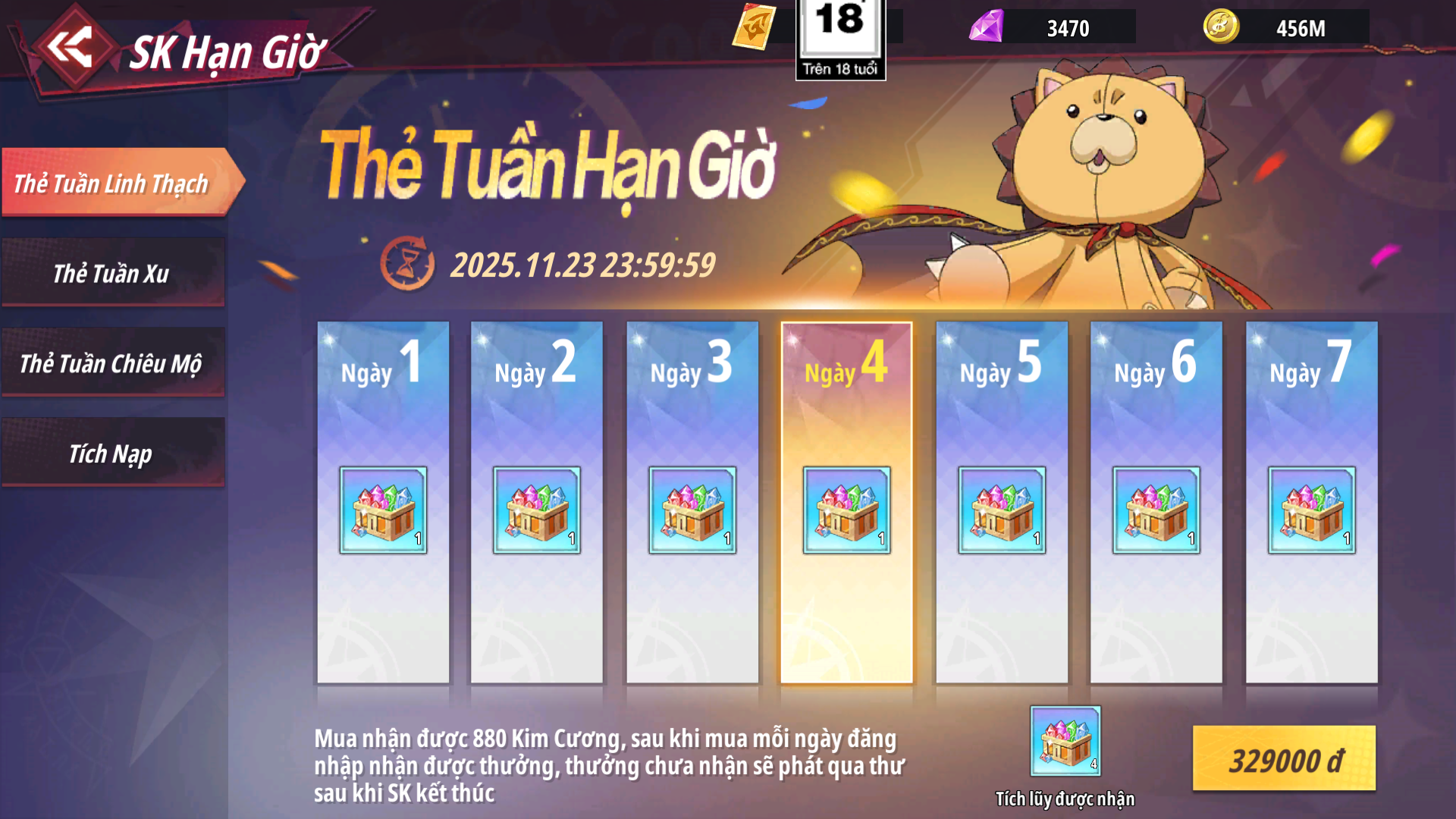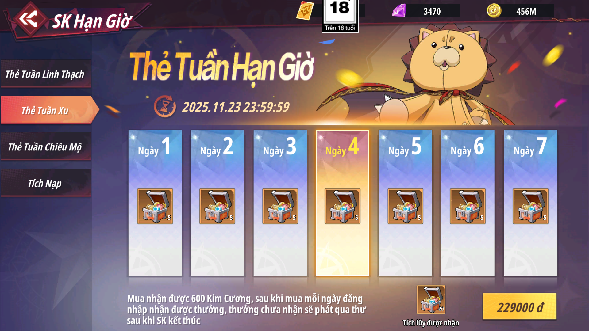- Sau khi mua hoàn trả nhận lại 600 Kim Cương, mỗi ngày đăng nhập nhận Rương Xu - Sơ theo mốc ngày, phần thưởng chưa nhận được sẽ tự động phát qua thư khi sự kiện kết thúc