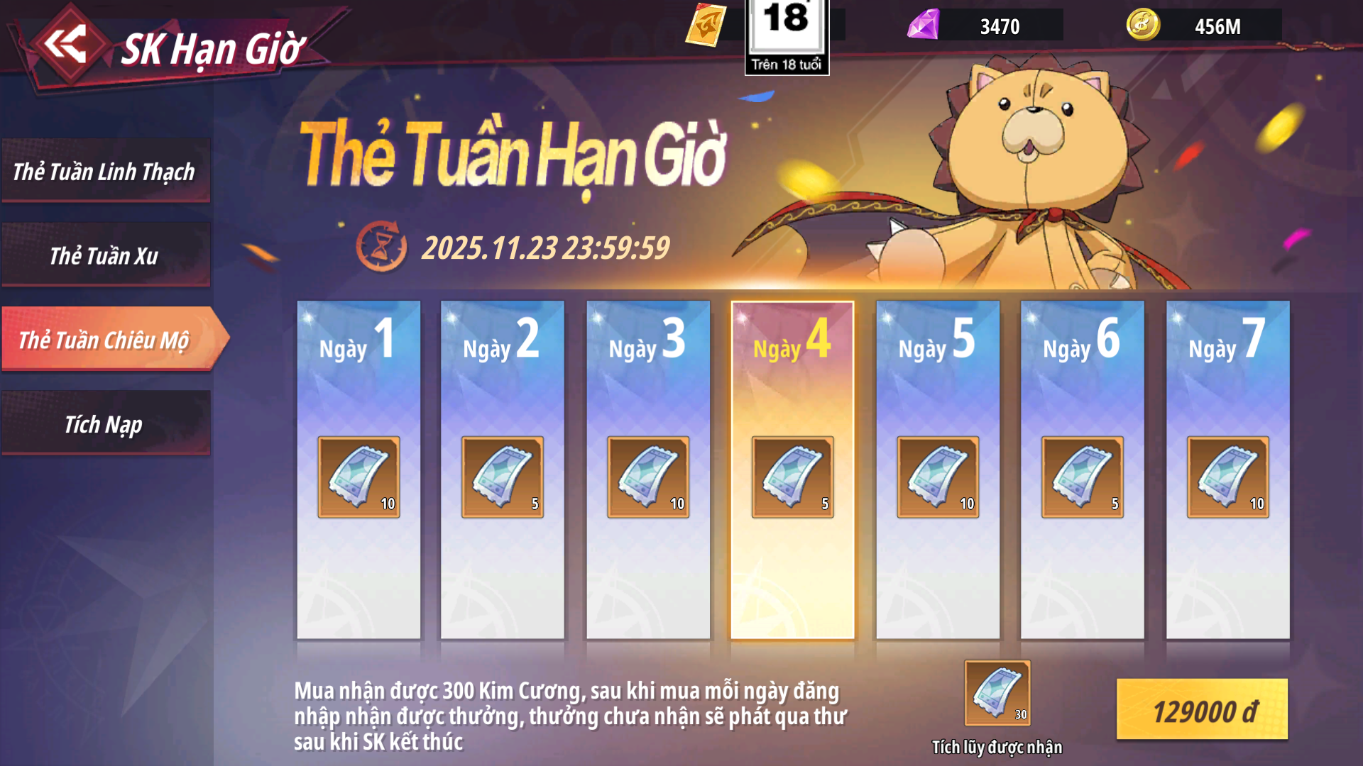 - Sau khi mua hoàn trả nhận lại 300 Kim Cương, mỗi ngày đăng nhập nhận Quà Vé Chiêu Mộ theo mốc ngày, phần thưởng chưa nhận được sẽ tự động phát qua thư khi sự kiện kết thúc