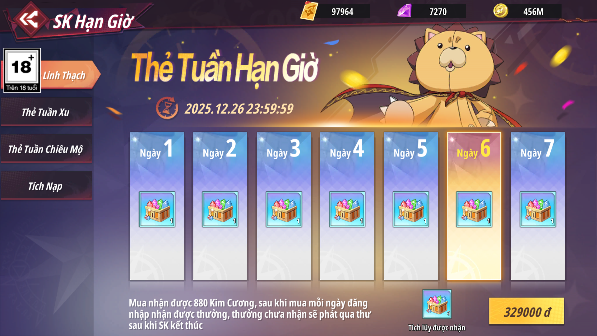 - Mỗi ngày: 1 lượt miễn phí, thêm tối đa 7 lượt mua bằng Kim Cương.