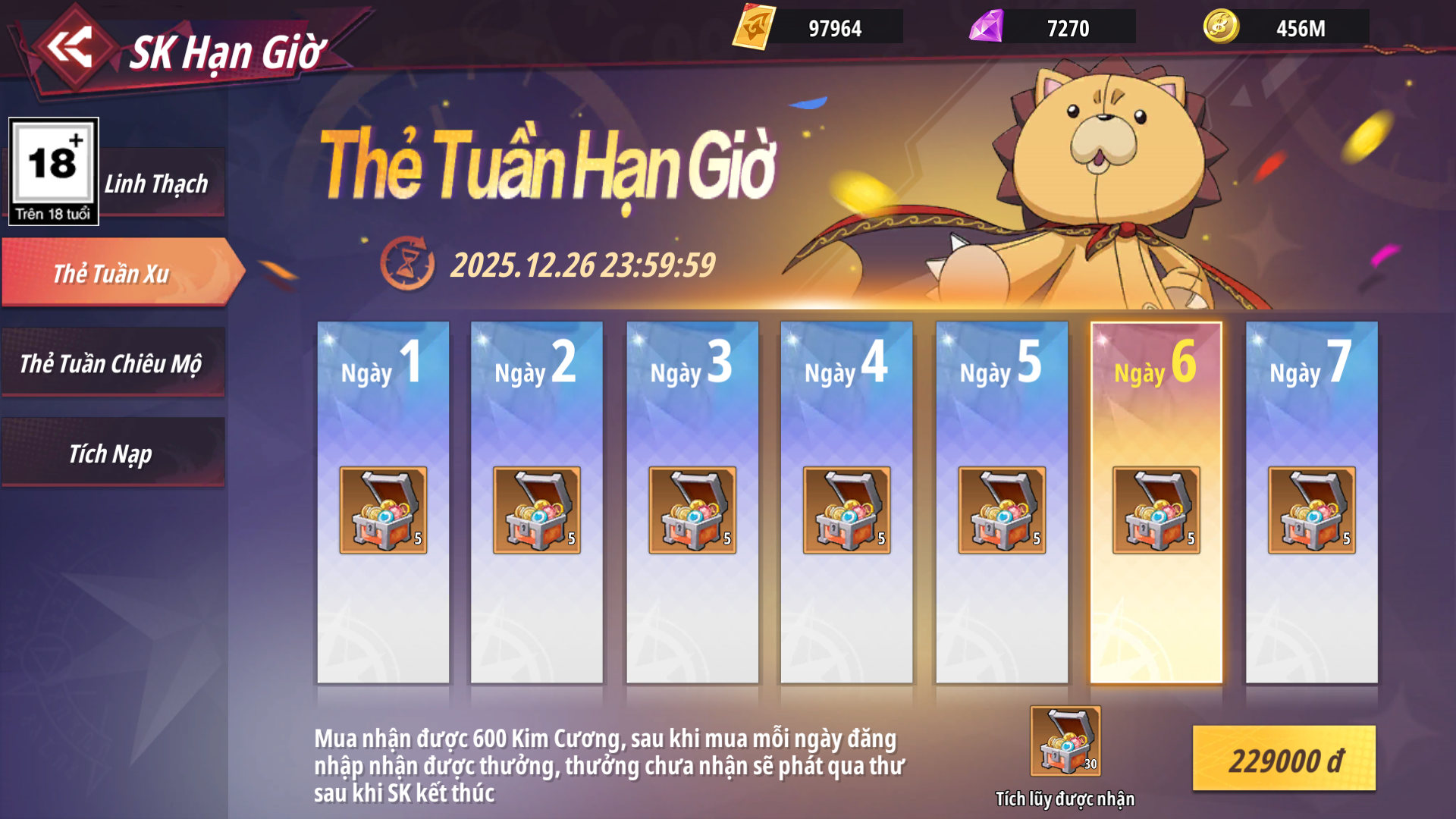 - Sau khi mua hoàn trả nhận lại 600 Kim Cương, mỗi ngày đăng nhập nhận Rương Xu - Sơ theo mốc ngày, phần thưởng chưa nhận được sẽ tự động phát qua thư khi sự kiện kết thúc