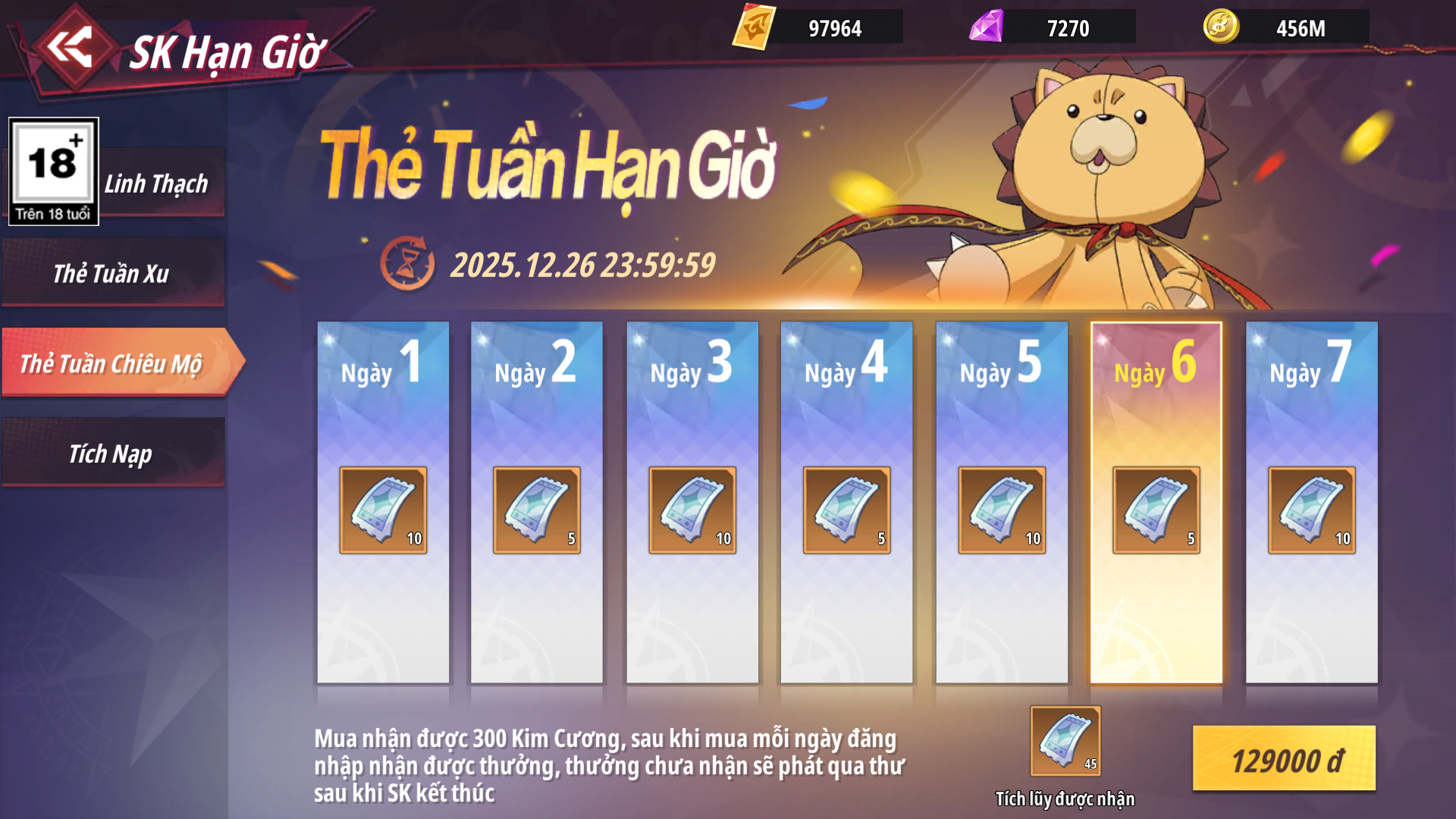 - Sau khi mua hoàn trả nhận lại 300 Kim Cương, mỗi ngày đăng nhập nhận Quà Vé Chiêu Mộ theo mốc ngày, phần thưởng chưa nhận được sẽ tự động phát qua thư khi sự kiện kết thúc