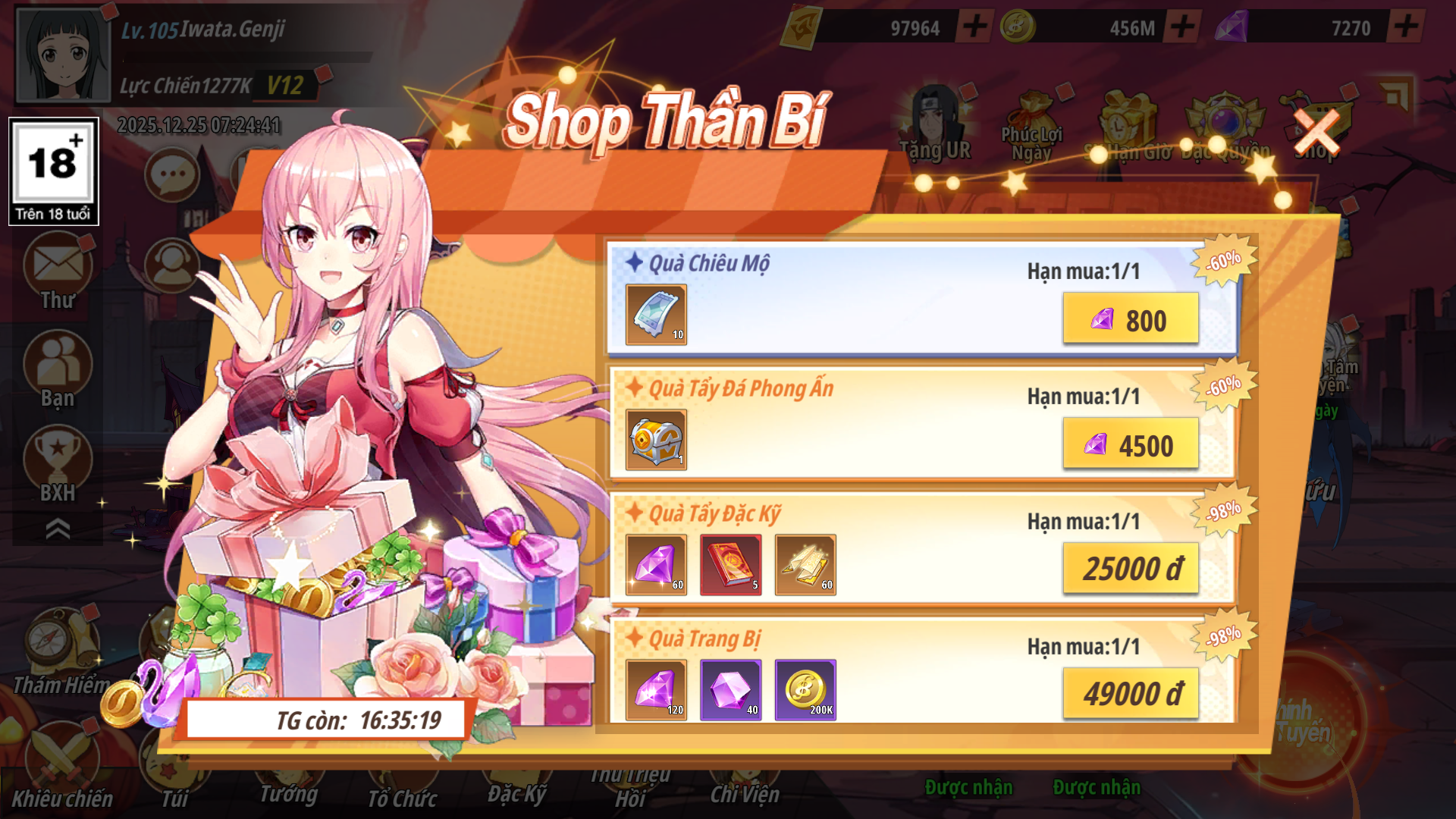 - Shop Thần Bí gồm các gói quà có hạn mua với nhiều phần thưởng nguyên liệu quý hiếm, hoàn trả kim cương theo giá trị gói và làm mới theo ngày ( trong thời gian diễn ra sự kiện ).