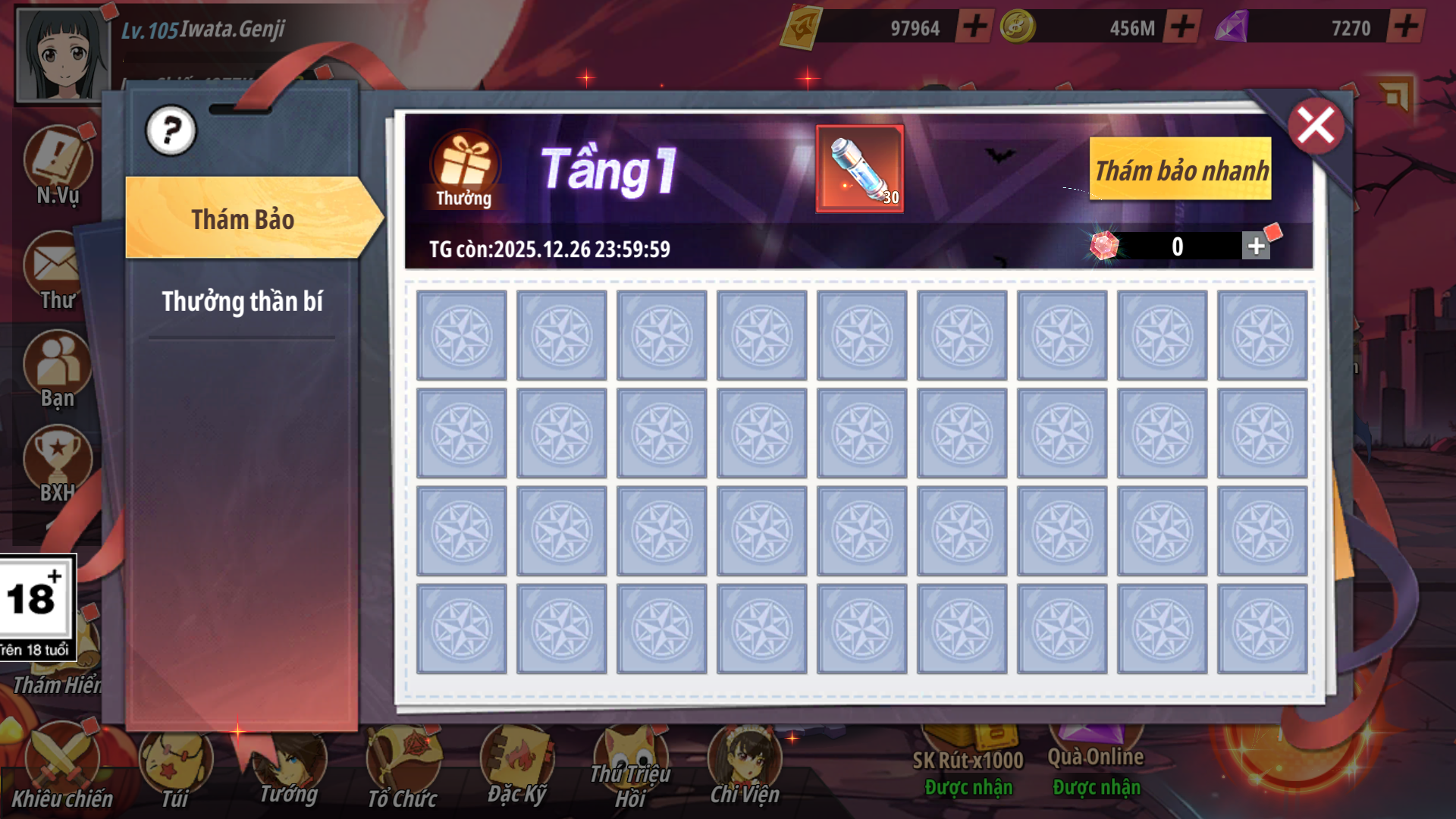 - Khi thám bảo từng tầng, có tỉ lệ nhận Kho Báu đã chọn; nếu chưa có thì lần cuối ở tầng đó sẽ chắc chắn nhận.