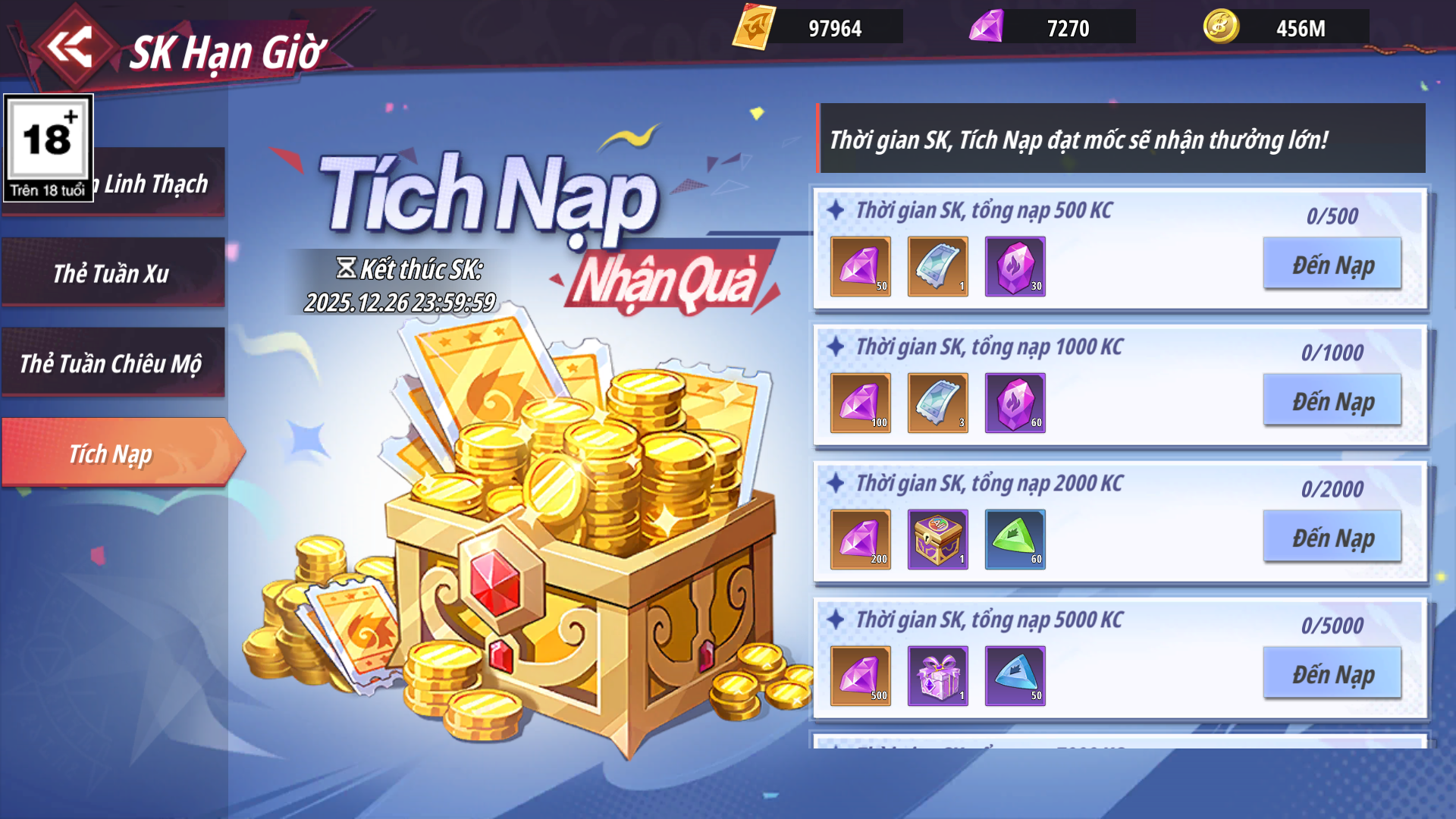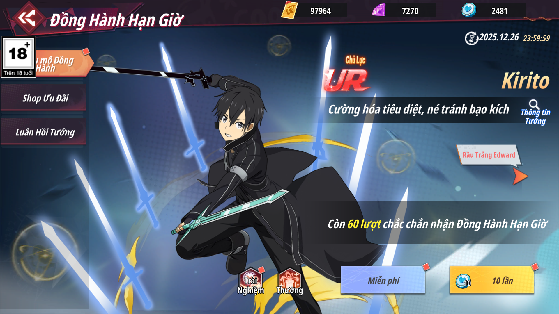 - Shop Ưu Đãi: Các gói có hạn mua nhất định nhận được Xu Đồng Hành dùng để chiêu mộ đồng hành được tướng UR Kirito , Râu Trắng Edward và Lacus