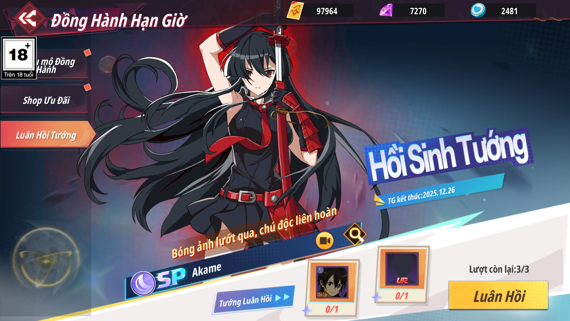 + Tham gia sự kiện Đồng Hành Hạn Giờ - Akame, người chơi có cơ hội sở hữu SP – Akame.