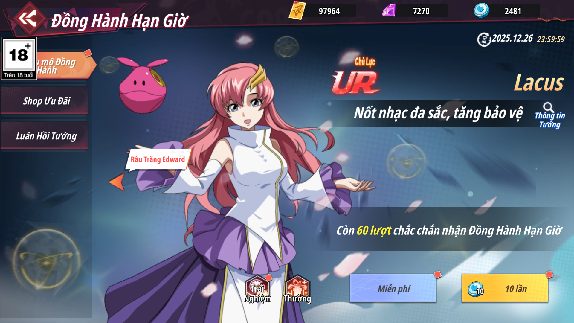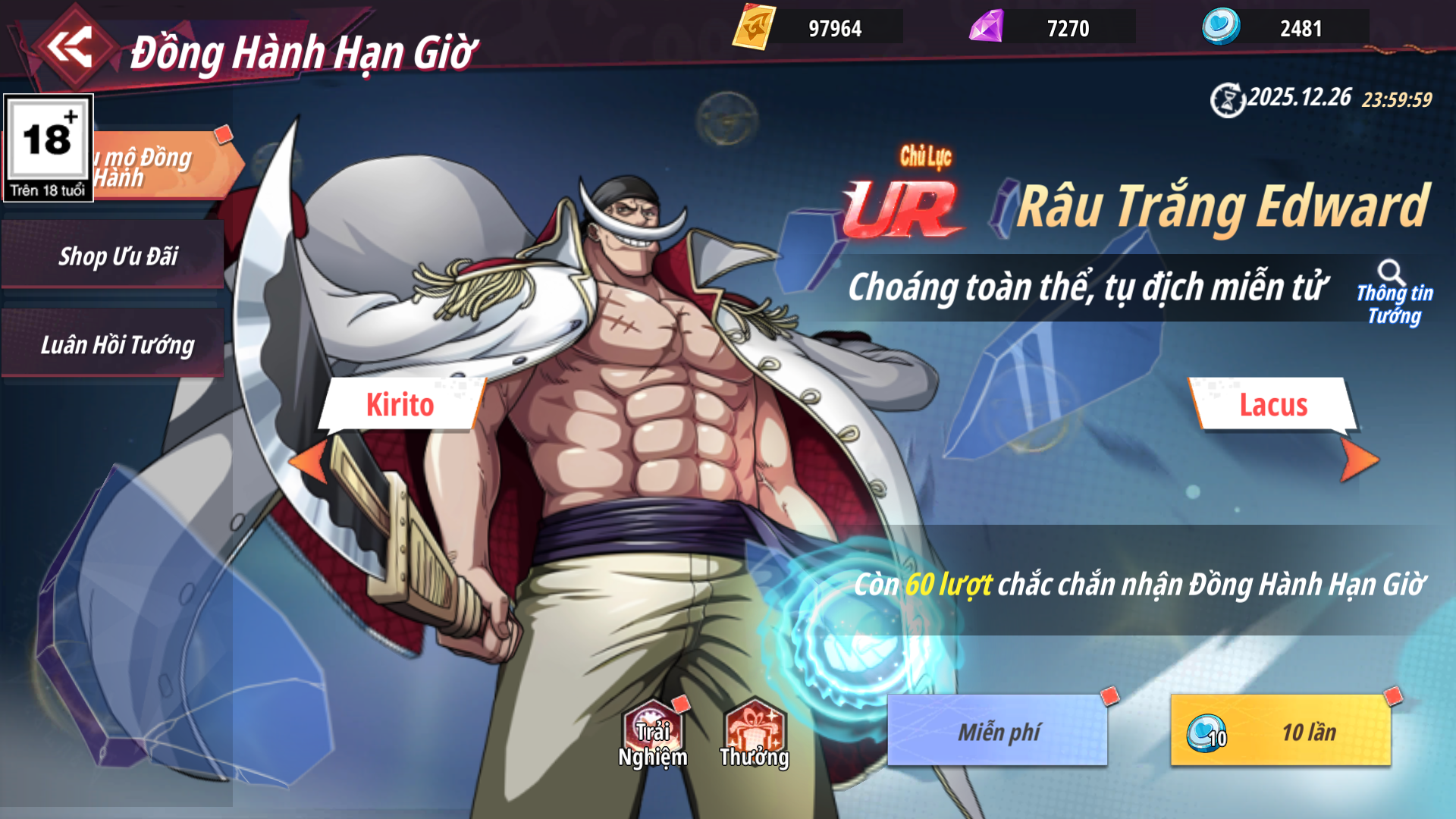 - Tham gia sự kiện Đồng Hành Hạn Giờ có cơ hội nhận được tướng UR Chủ lực Kirito , Râu Trắng Edward và Lacus