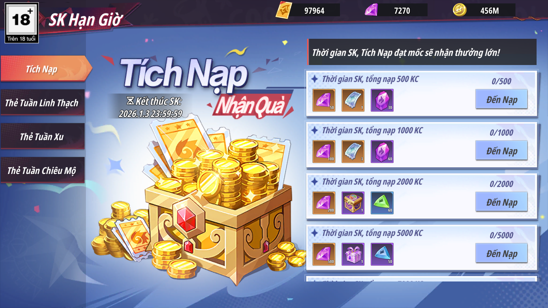 - Shop Ưu Đãi: Các gói có hạn mua nhất định nhận được Xu Đồng Hành dùng để chiêu mộ đồng hành được tướng UR Kirito , Râu Trắng Edward và Lacus