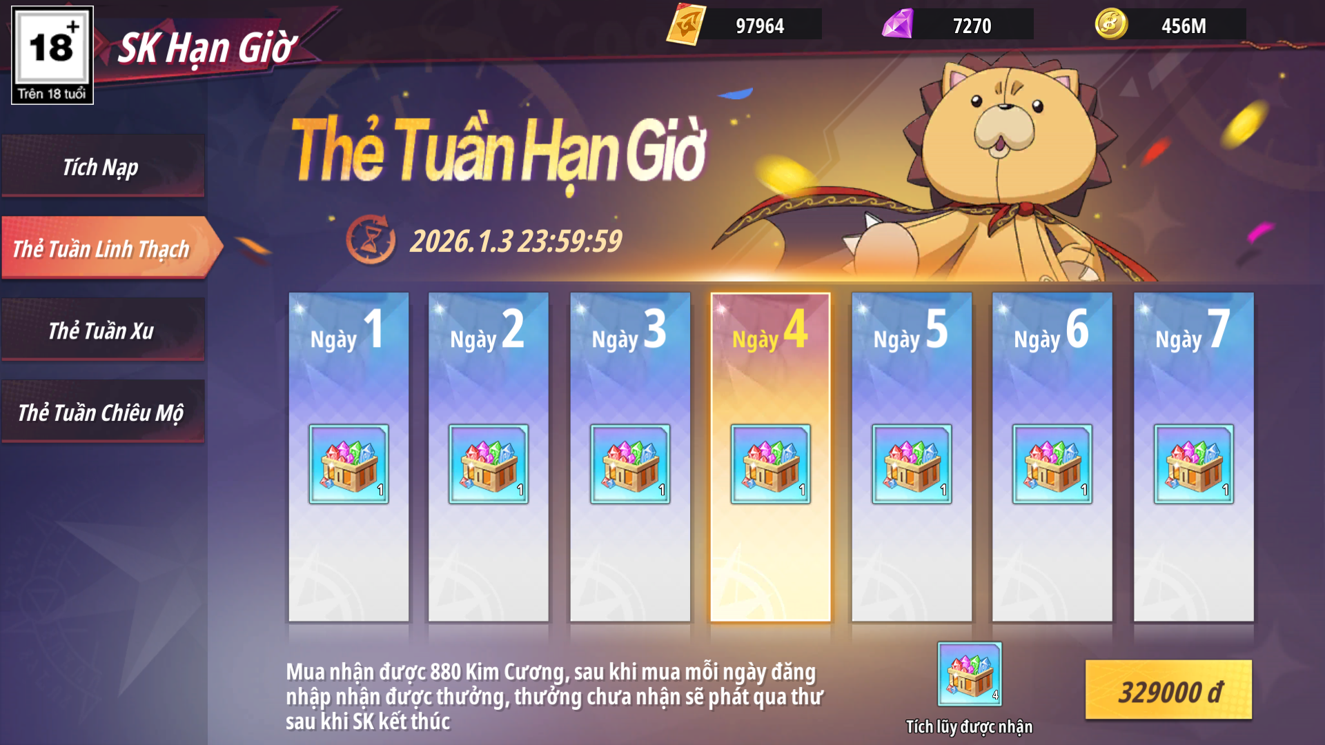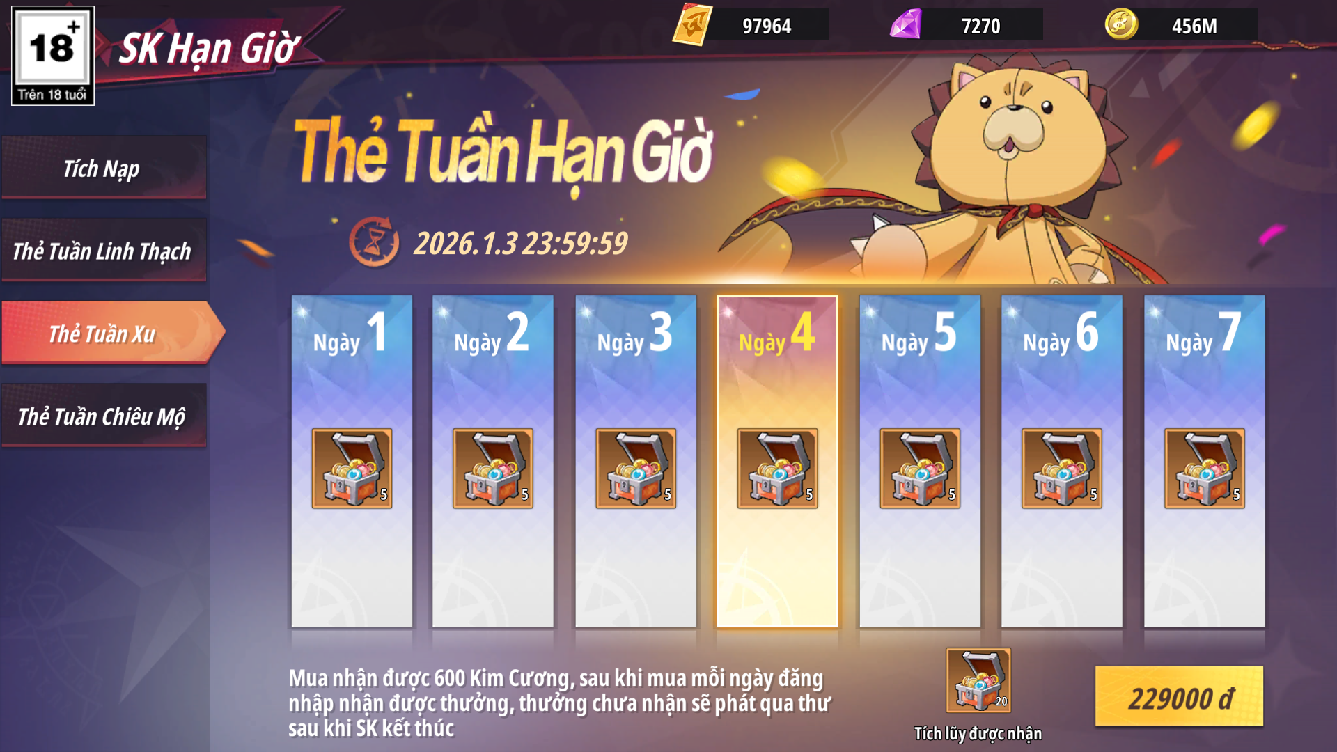 - Sau khi mua hoàn trả nhận lại 600 Kim Cương, mỗi ngày đăng nhập nhận Rương Xu - Sơ theo mốc ngày, phần thưởng chưa nhận được sẽ tự động phát qua thư khi sự kiện kết thúc
