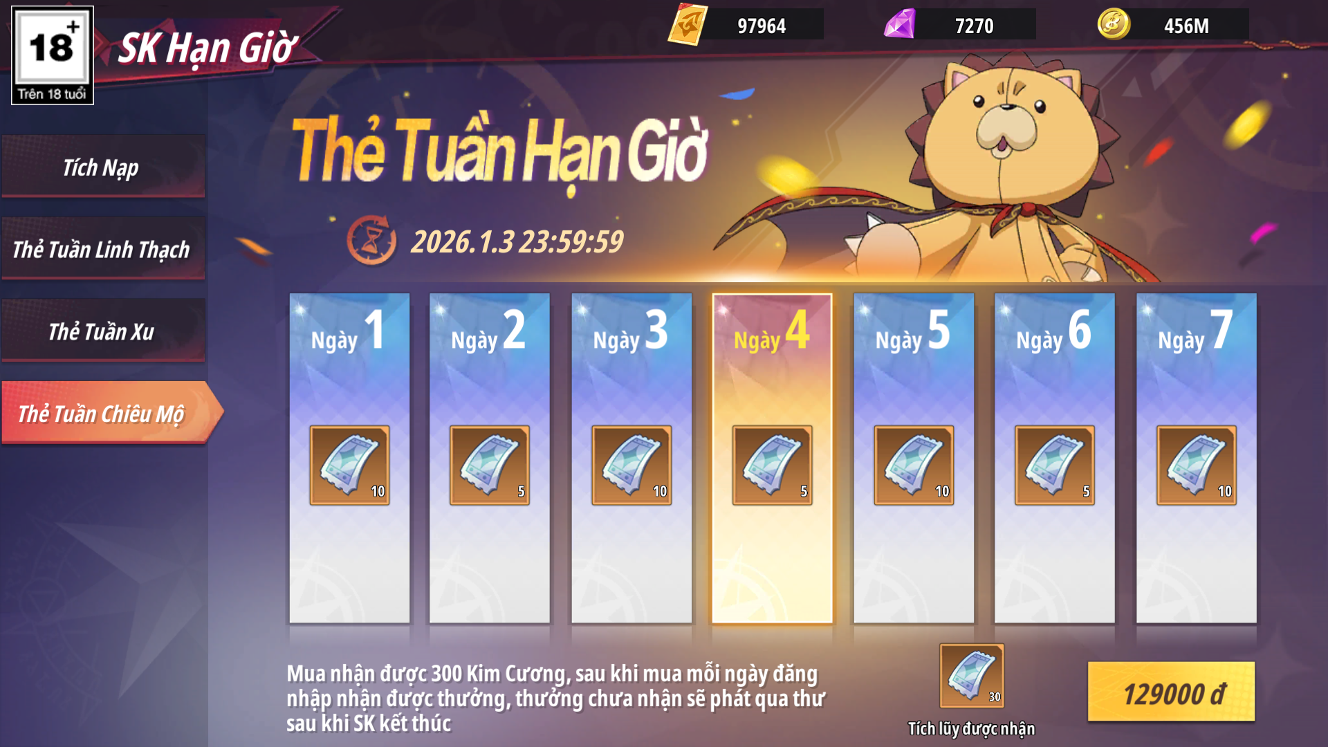 - Sau khi mua hoàn trả nhận lại 300 Kim Cương, mỗi ngày đăng nhập nhận Quà Vé Chiêu Mộ theo mốc ngày, phần thưởng chưa nhận được sẽ tự động phát qua thư khi sự kiện kết thúc