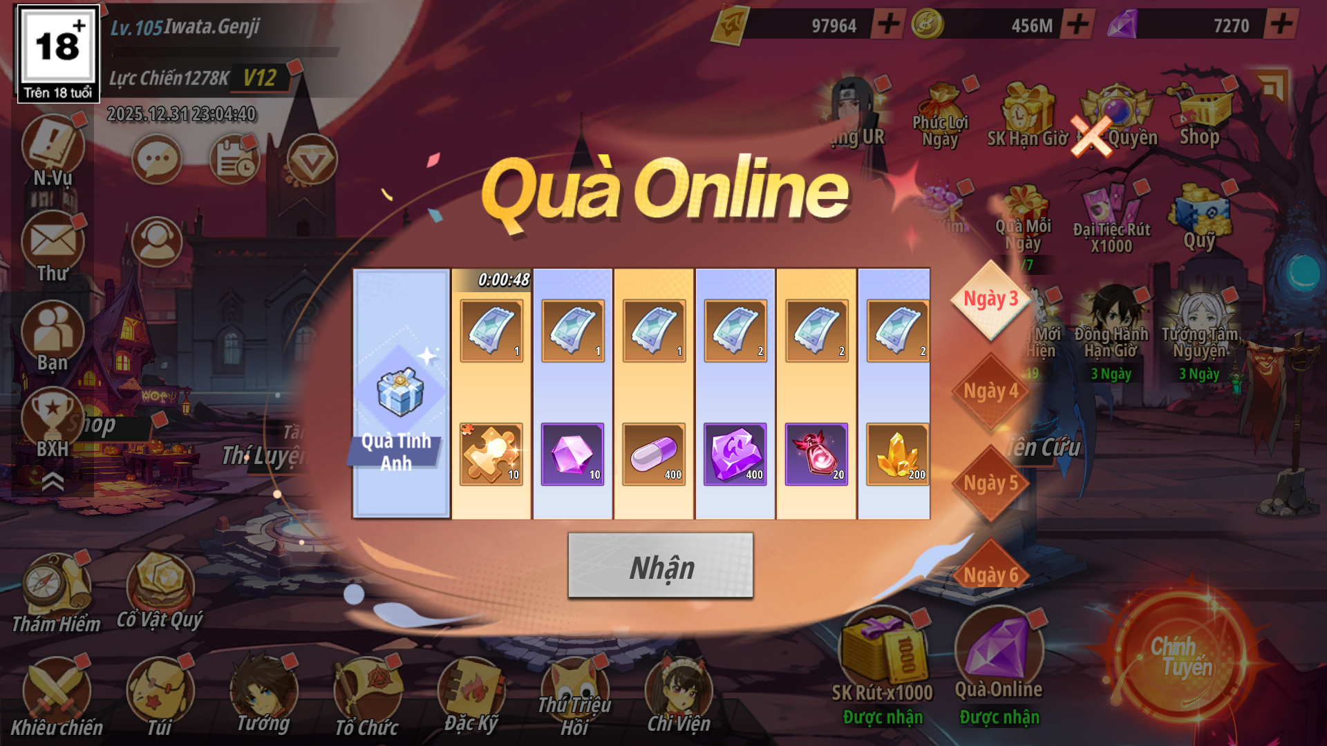 - Tiến hành đăng nhập và online game mỗi ngày đạt đủ điều kiện của mốc sẽ được nhận thưởng