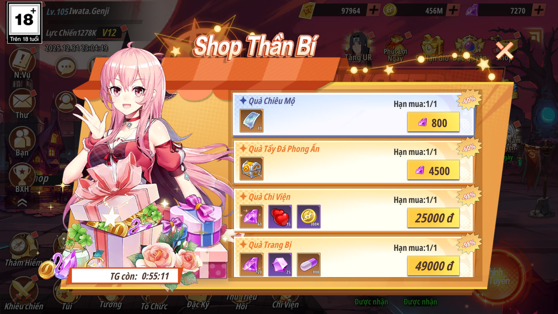 - Shop Thần Bí gồm các gói quà có hạn mua với nhiều phần thưởng nguyên liệu quý hiếm, hoàn trả kim cương theo giá trị gói và làm mới theo ngày ( trong thời gian diễn ra sự kiện ).
