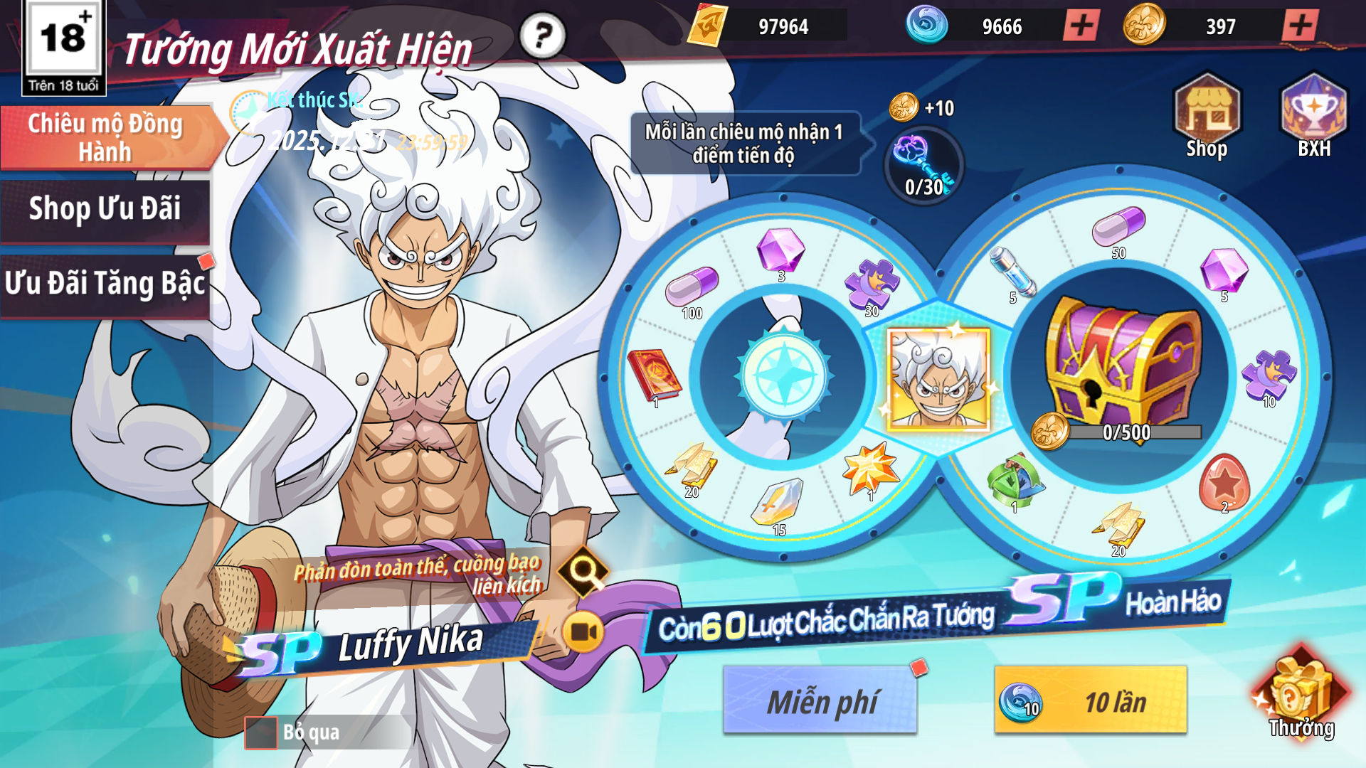 - Shop Ưu Đãi: Bán các gói giới hạn, nhận Xu Thần Thoại dùng để chiêu mộ đồng hành cùng SP – Luffy Nika.