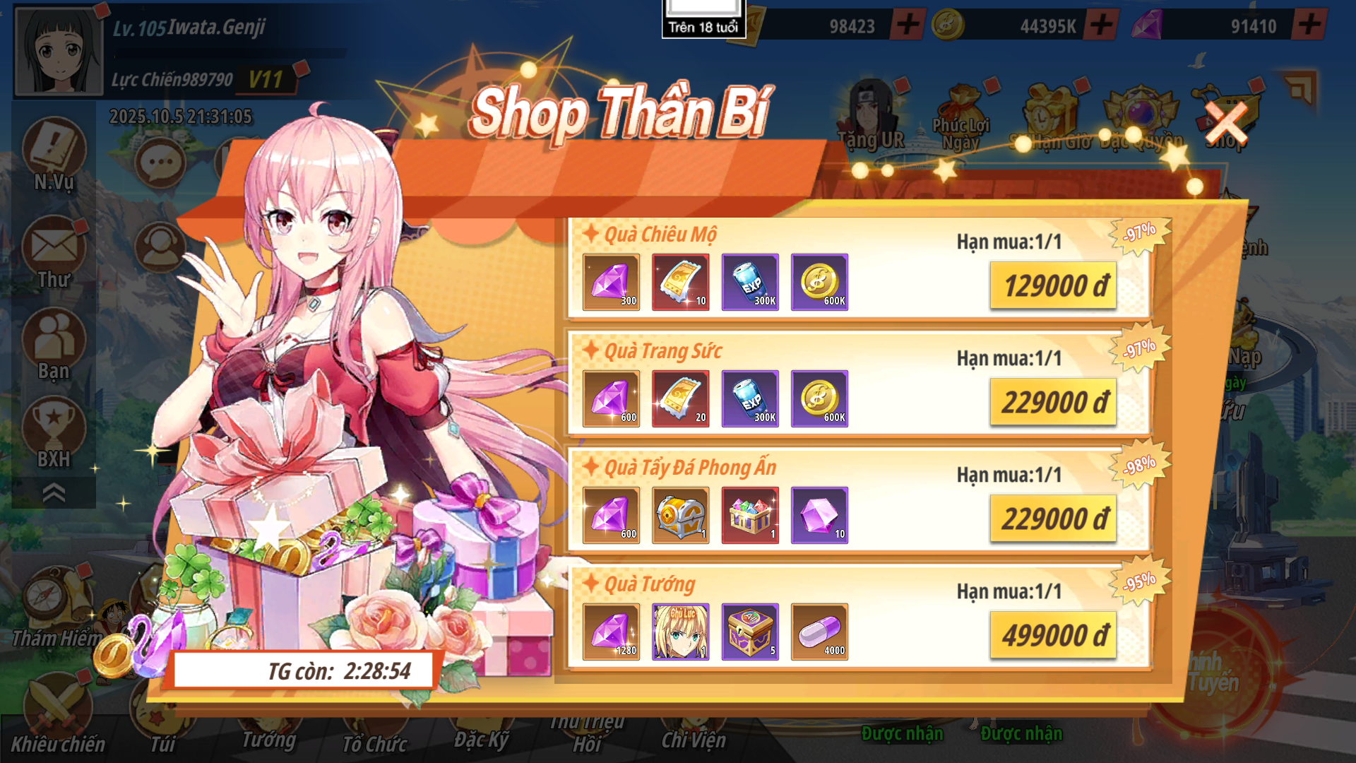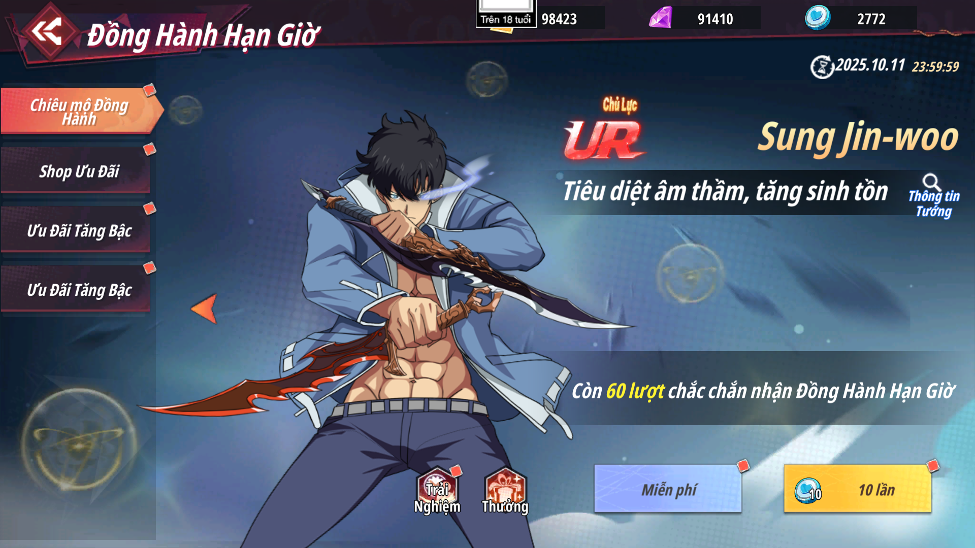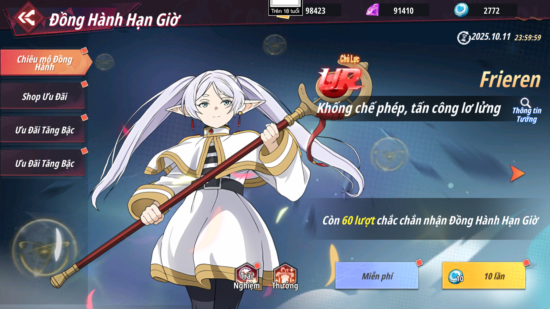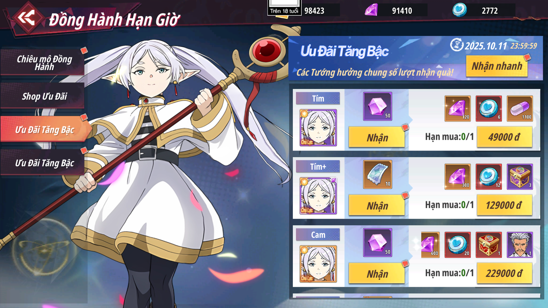 - Shop Ưu Đãi: Các gói có hạn mua nhất định nhận được Xu Đồng Hành dùng để chiêu mộ đồng hành được tướng UR chủ lực - Frieren và Sung Jin-woo