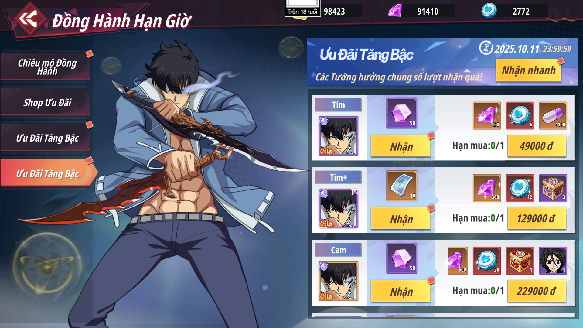 - Ưu Đãi Tăng Bậc: Nâng cấp tướng Đồng Hành lên bậc nhất định để nhận và mở khóa các gói với phần thưởng nguyên liệu hiếm, có hoàn trả kim cương theo giá trị nạp.