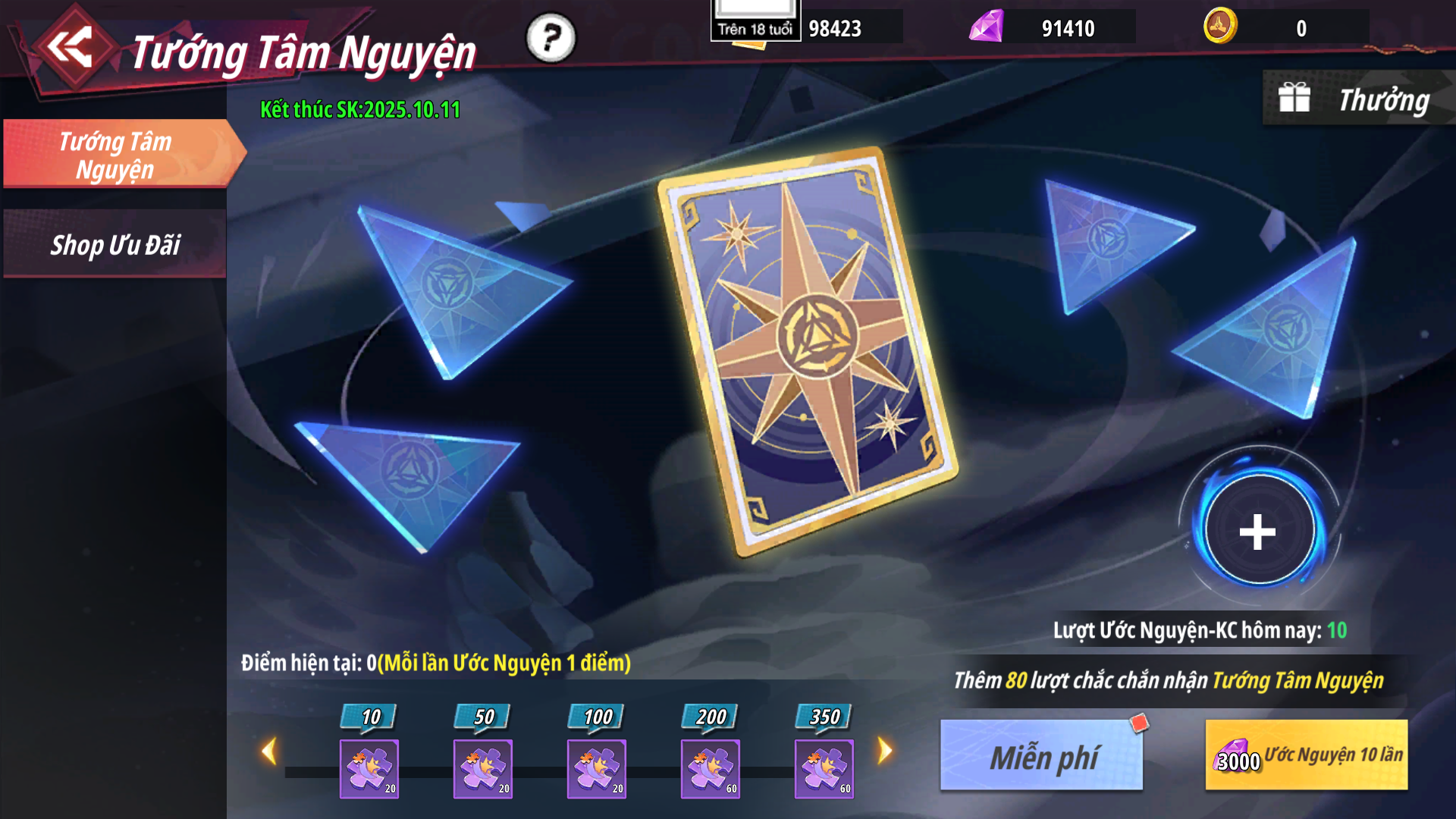 - Mỗi kỳ sẽ chỉ định một tướng khác nhau, có thể tiêu hao Xu Tâm Nguyện hoặc Kim Cương để ước nguyện, đạt số lượng đảm bảo nhận Tướng Tâm Nguyện sau khi rút trúng sẽ cài lại số lượt tính lại từ đầu, trường hợp người chơi có Xu Tâm Nguyện hệ thống sẽ ưu tiên sử dụng xu này.