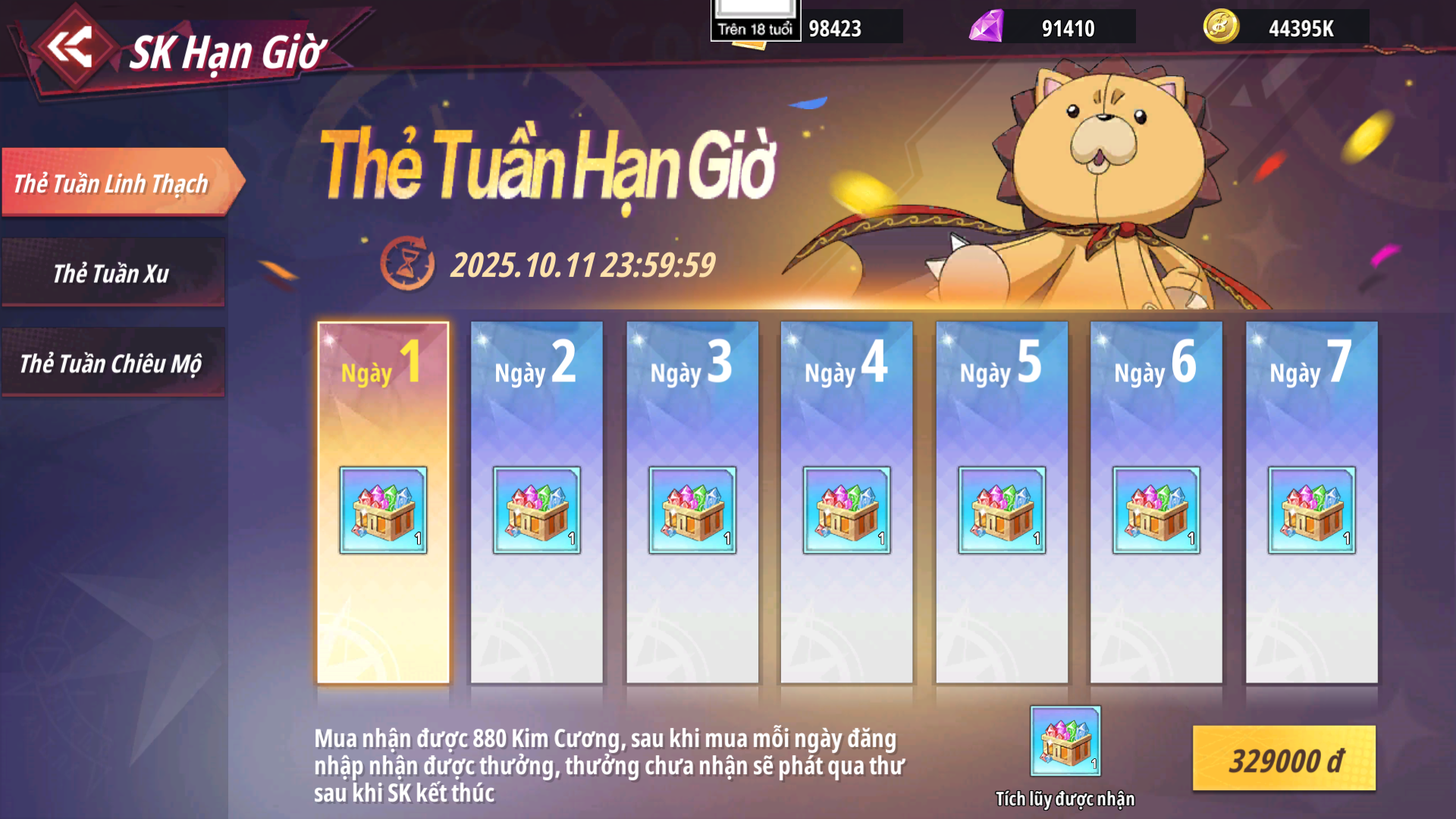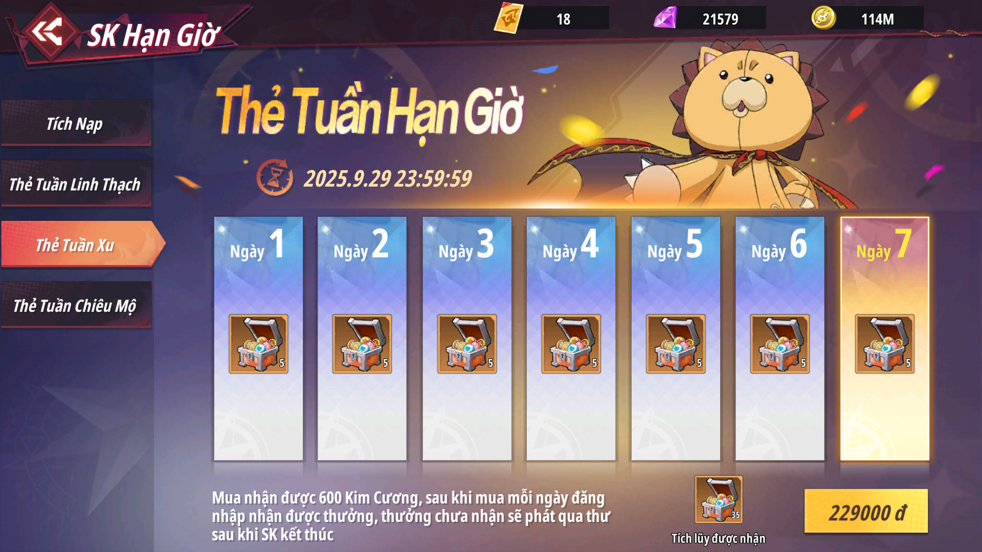 - Sau khi mua hoàn trả nhận lại 880 Kim Cương, mỗi ngày đăng nhập nhận Rương Xu - Sơ theo mốc ngày, phần thưởng chưa nhận được sẽ tự động phát qua thư khi sự kiện kết thúc