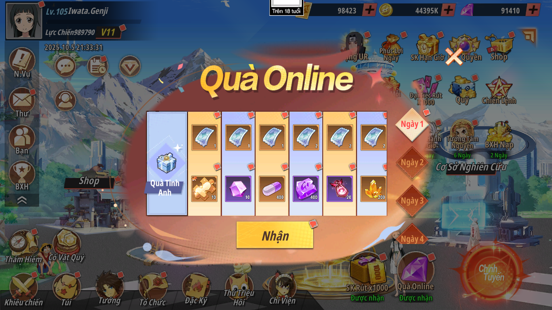 - Tiến hành đăng nhập và online game mỗi ngày đạt đủ điều kiện của mốc sẽ được nhận thưởng