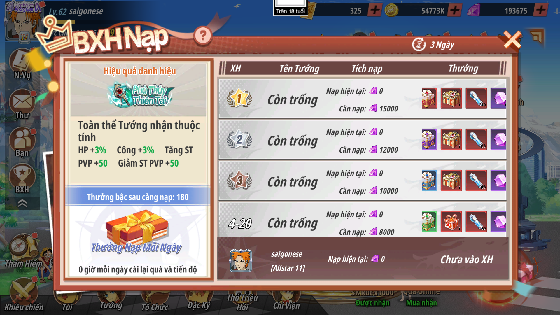 - Mỗi mức hạn có các mốc tiêu phí tương ưng, người chơi cần đạt đủ tương ứng mới lên được BXH Nạp