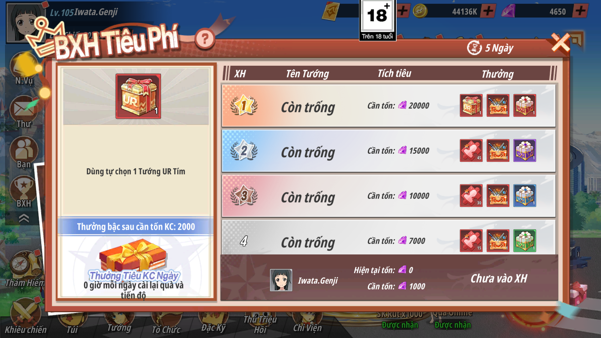 - Người chơi dùng Kim Cương để tham gia BXH Tiêu Phí, tiêu càng nhiều – thứ hạng càng cao, phần thưởng càng giá trị.
