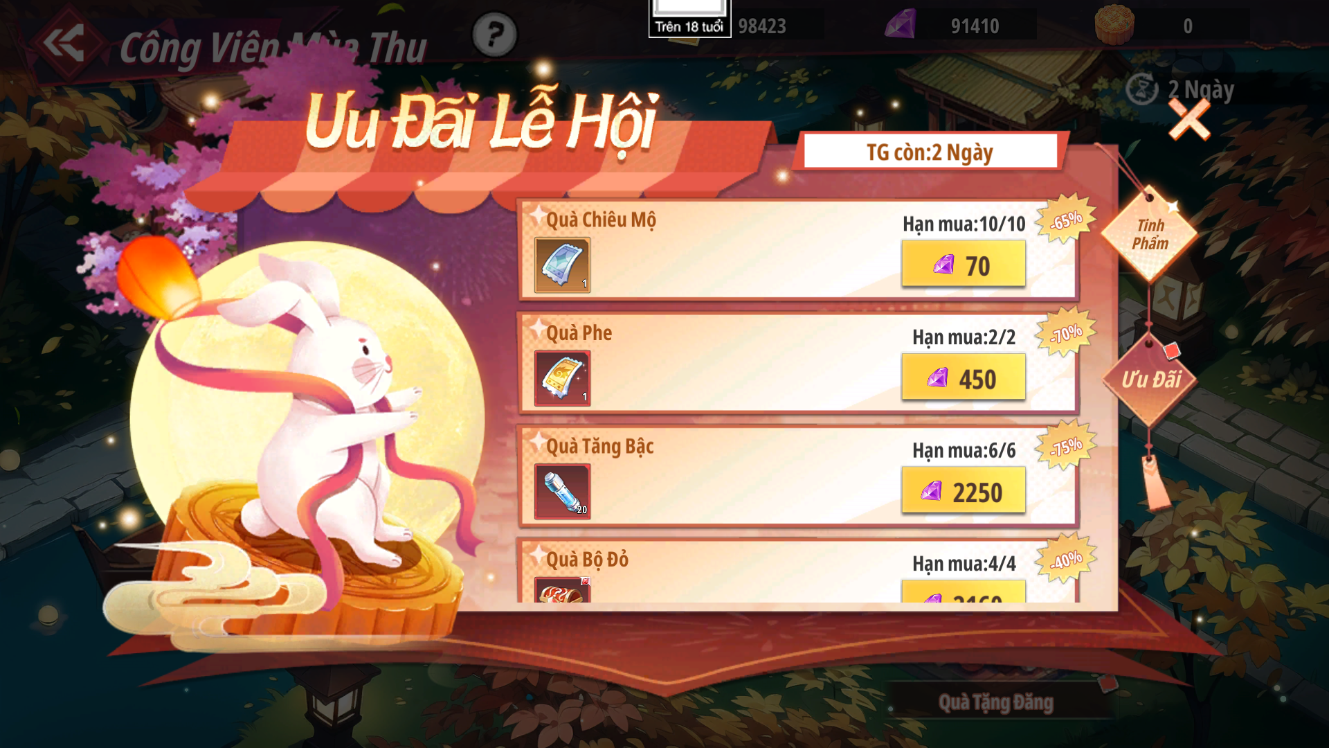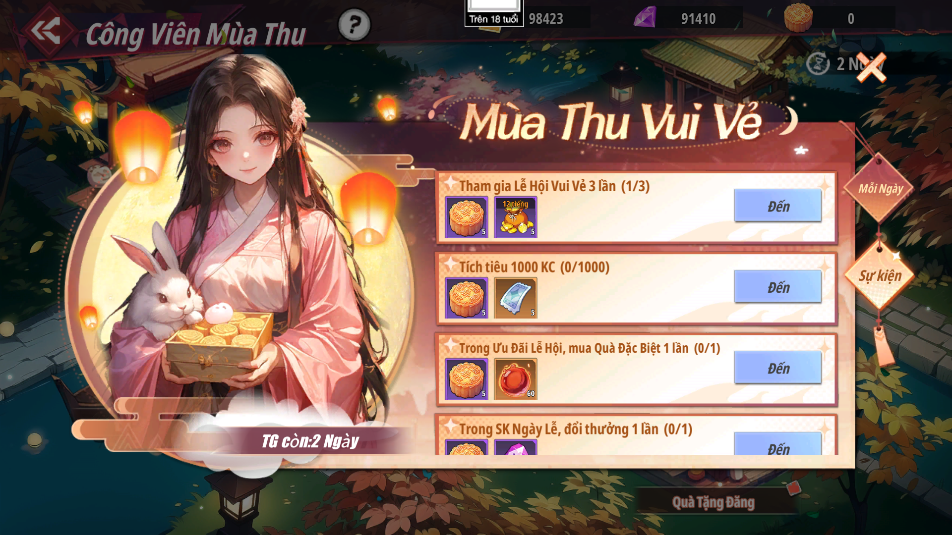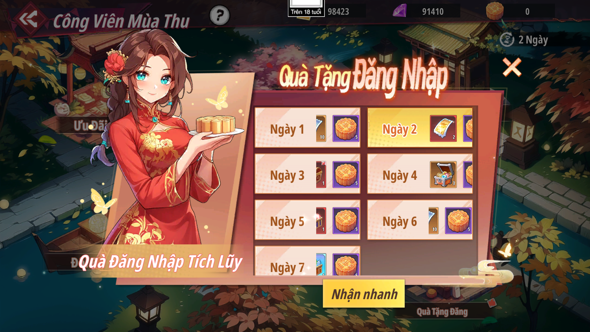 - Đăng nhập liên tục trong 7 ngày để nhận các phần thưởng giá trị như: Bánh Trung Thu, Vé Chiêu Mộ, Quà Chọn Linh Thạch Bậc 2, Quà Chọn TB Toàn Hệ Đỏ+,...