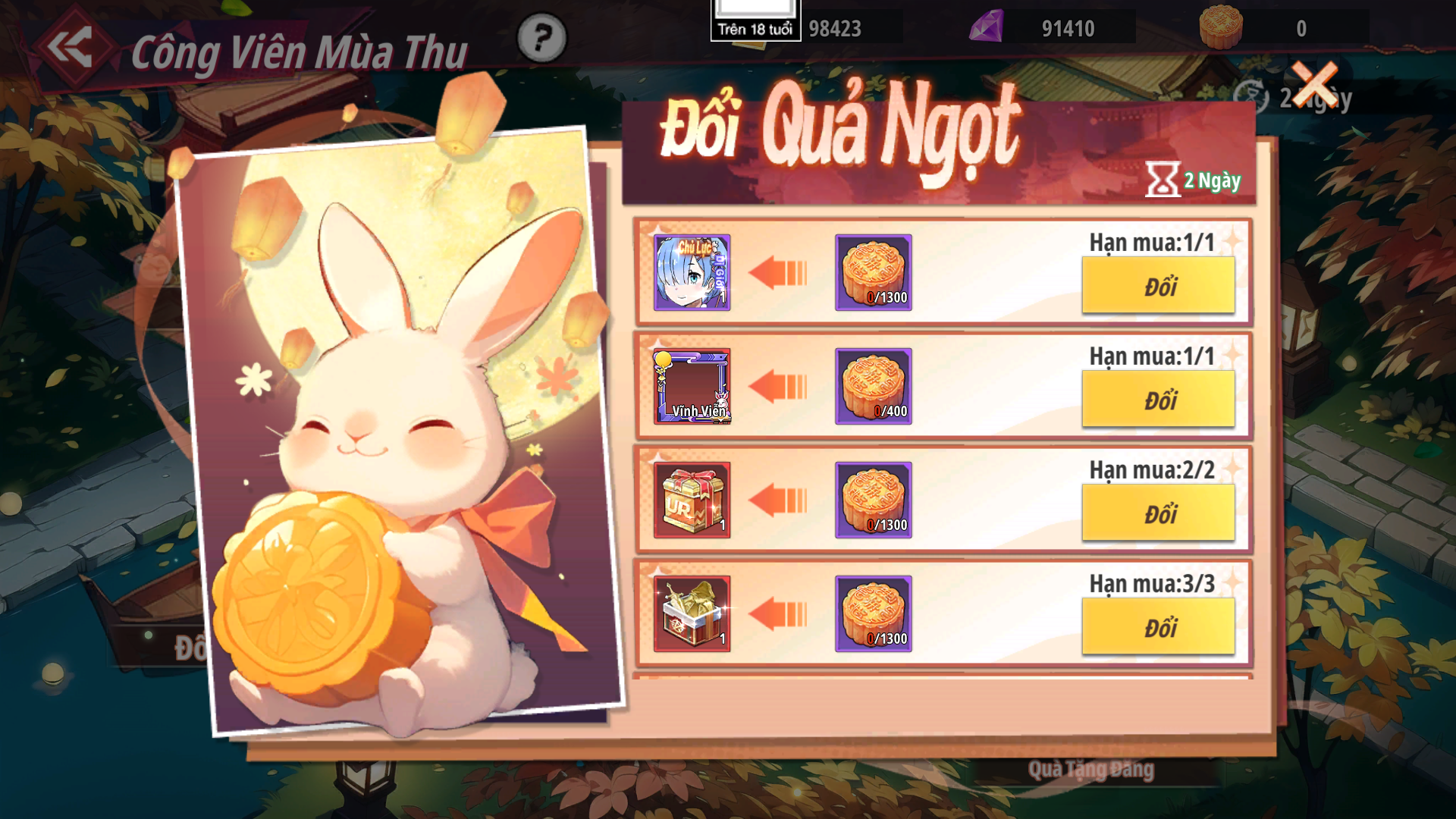 - Sử dụng Bánh Trung Thu nhận được từ sự kiện Công Viên Mùa Thu để đổi các phần quà hấp dẫn như: Tướng Dị Giới UR - Rem, Khung Avatar, Quà Chọn TB,...