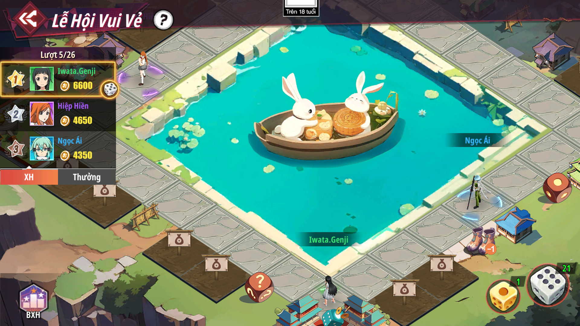 - Tiến hành tung Xúc Xắc thường hoặc Vàng để di chuyển đến các ô.