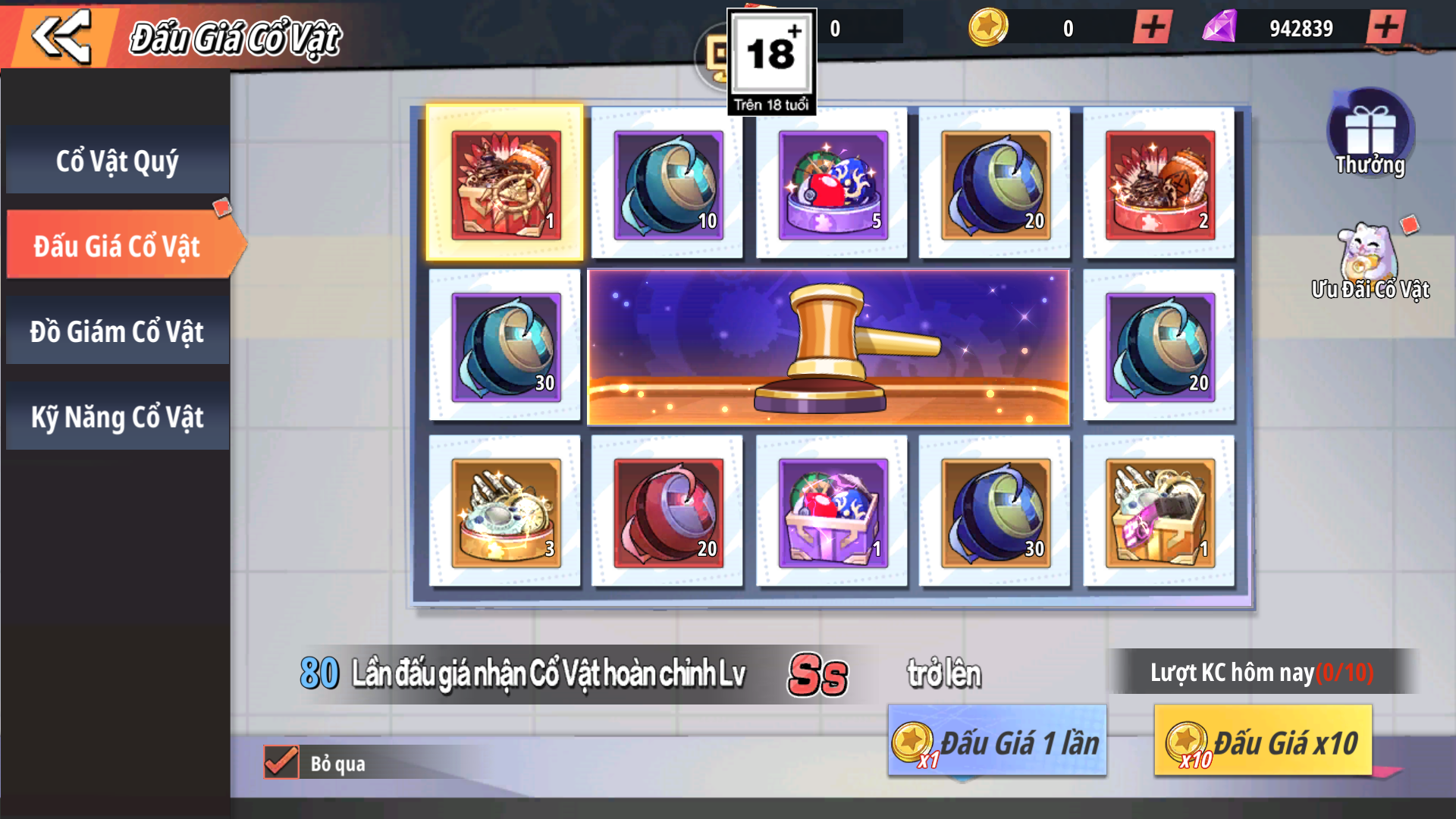 - 80 lần đấu giá đảm bảo nhận Cổ Vật ( cộng dồn cả lượt dùng Kim Cương và Xu Đấu Giá ).