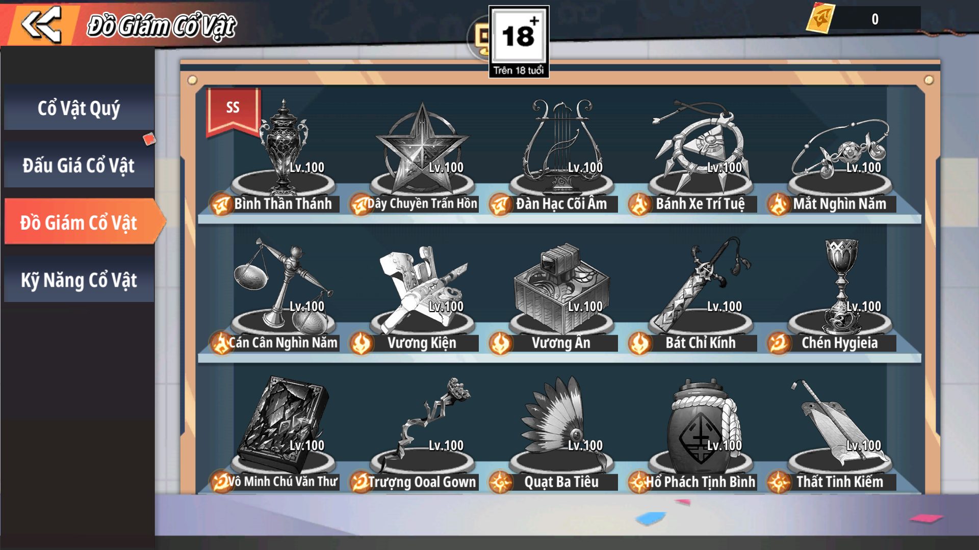 - Nơi trưng bày tất cả Cổ Vật hiện có trong game, người chơi có thể xem trước Thuộc Tính của Cổ Vật, sau đó có thể quyết định dồn tài nguyên để đạt được Cổ Vật mong muốn.
