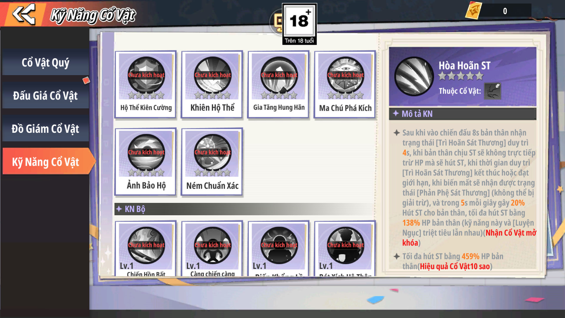 - Nơi trưng bày chi tiết các thuộc tính Kỹ Năng của Cổ Vật