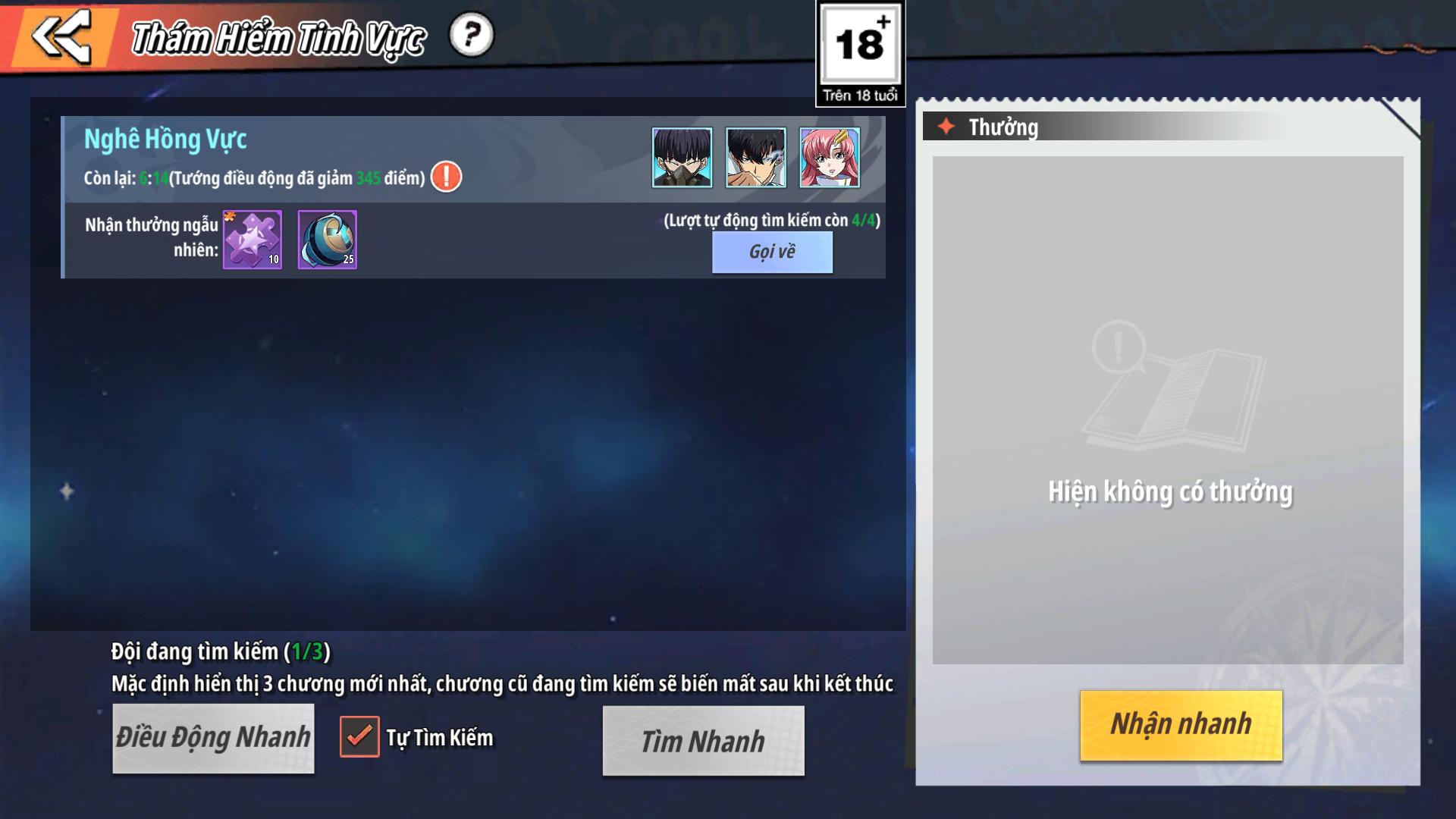- Hỗ trợ tự động tìm kiếm: khi kết thúc sẽ tiêu hao lượt và nhận thưởng, sau đó lượt sẽ hồi về tối đa.